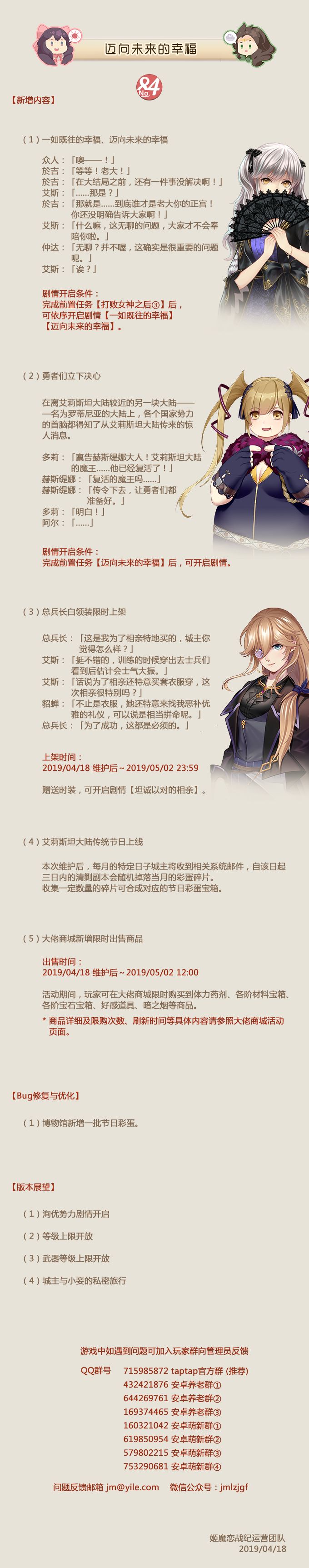 各位城主:《姬魔恋战纪》将于4月4日进行更新维护,请各位城主留意更新时间哦!本次更新完后,刘备(琉弥)好感将开放至八心,是不是期待很久了呢?!届时新一轮的战姬升心投票活动将开启,谁又将成为人气王者?!我也有点小好奇呢O(∩_∩)O哈哈哈~对喽,苍星香侦探服、木鸢舞娘装、凰忠军装、枫世仕女服将永久上架喽。好像说的有点多哎,嘿嘿~~自己看公告吧.。.:*♡