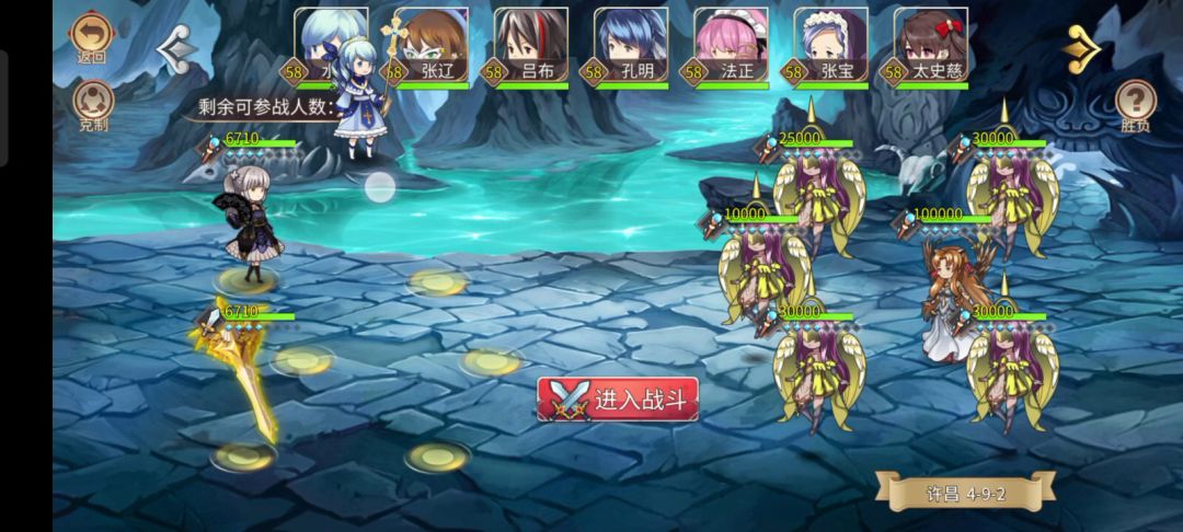 第一次发攻略,希望对大伙有点帮助。 张宝打了8武器谋略石,法正打了8武器,艾斯8武器武力石(法正,艾斯练度应该是可以降低的,只要把前上打死就好),别的就是七武器了, 大部分是57,58级,张角53级好像。大伙自己看一下。就不赘述了。 水镜我没衣服,58级99速度,然后喂了一颗速度丹,卡的100级速度。