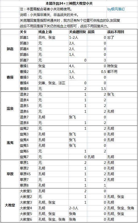 由于很多玩家在抱怨许昌34、三神图、大教堂战损爆炸,所以特制了这些关卡的小关低损版攻略,基本上战损都控制在0-2人左右,其中部分大关,如大教堂7也由优化成了无损。本攻略需配合笔者本篇推图攻略使用。练度等均相同。通篇采用了以孔明加谋+炮灰为核心的打法,均未使用张辽。如链接有挂了请留言。对应大关攻略合集https://www.taptap.com/topic/15837367许昌郭嘉小关h
