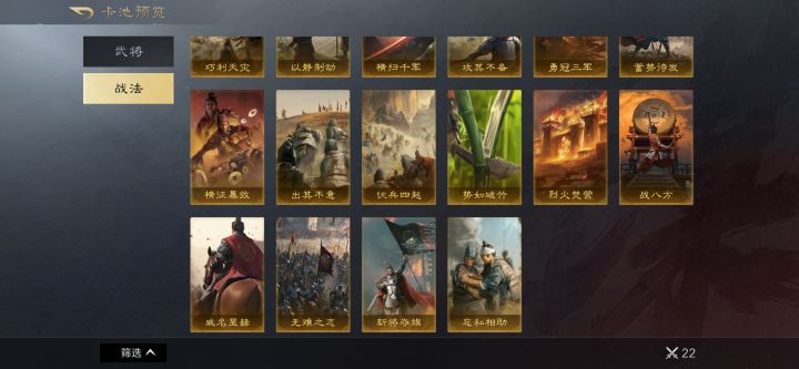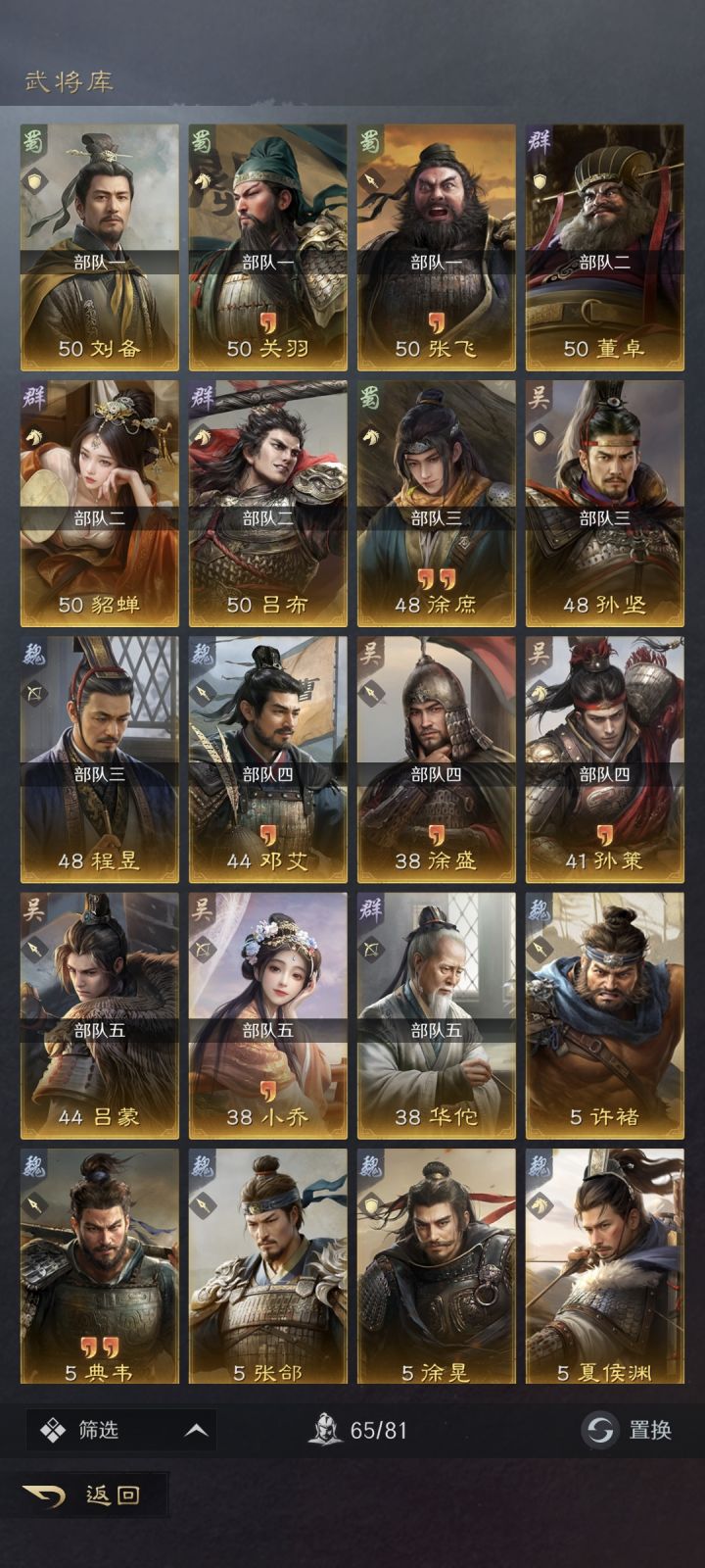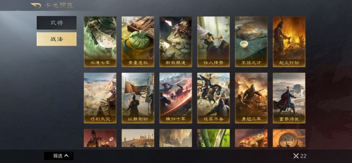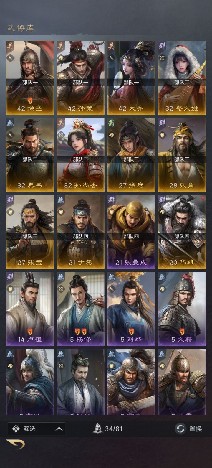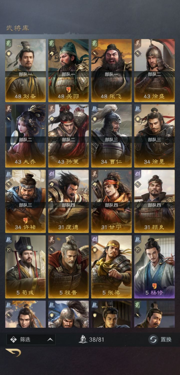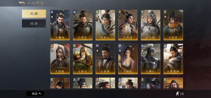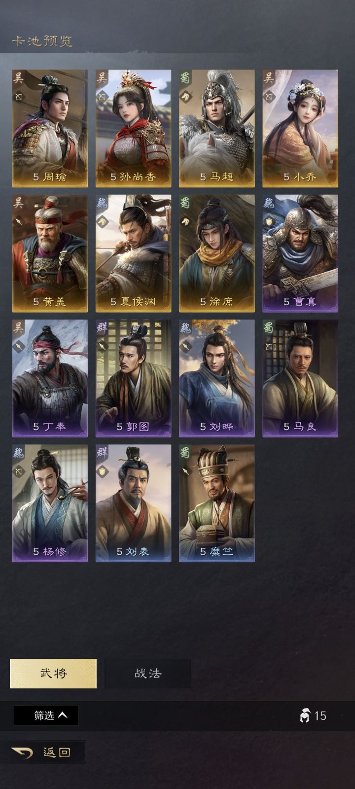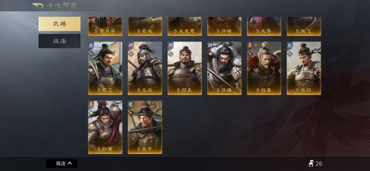 双大小月卡玩到现在21天大卡包抽了513抽小卡包只有雄姿英发的15抽,曹操是508抽出的,不算新手和充值送的橙卡张飞大乔孙策徐盛威名显赫,截止目前50金,27个橙将23个战法,5个重复,重复为张飞关平颜良任人择势威名显赫。