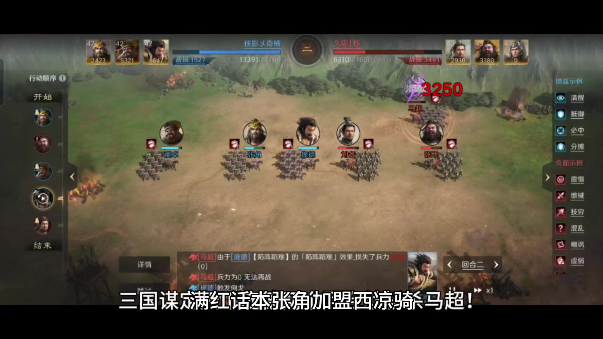 #三国谋定天下创作征集令 凭借着承天太平的效果加持,话本版张角自信满满的顶在前排,第二和第三战法,选择装备了忘私相助和铸甲销戈。此时的张角还获得了重盾兵的基础属性不屈,再减伤8%。全部算上求和,张角前三回合最多减伤幅度达到了54.5%。 董卓在此战侧重于削弱敌方,战法配置由权倾朝野、战八方和运筹帷幄组成,韬略选择研读了文武善本、兵情手抄和军争善本。其中最重点削弱的数据,是对方武将们的统率,从而为