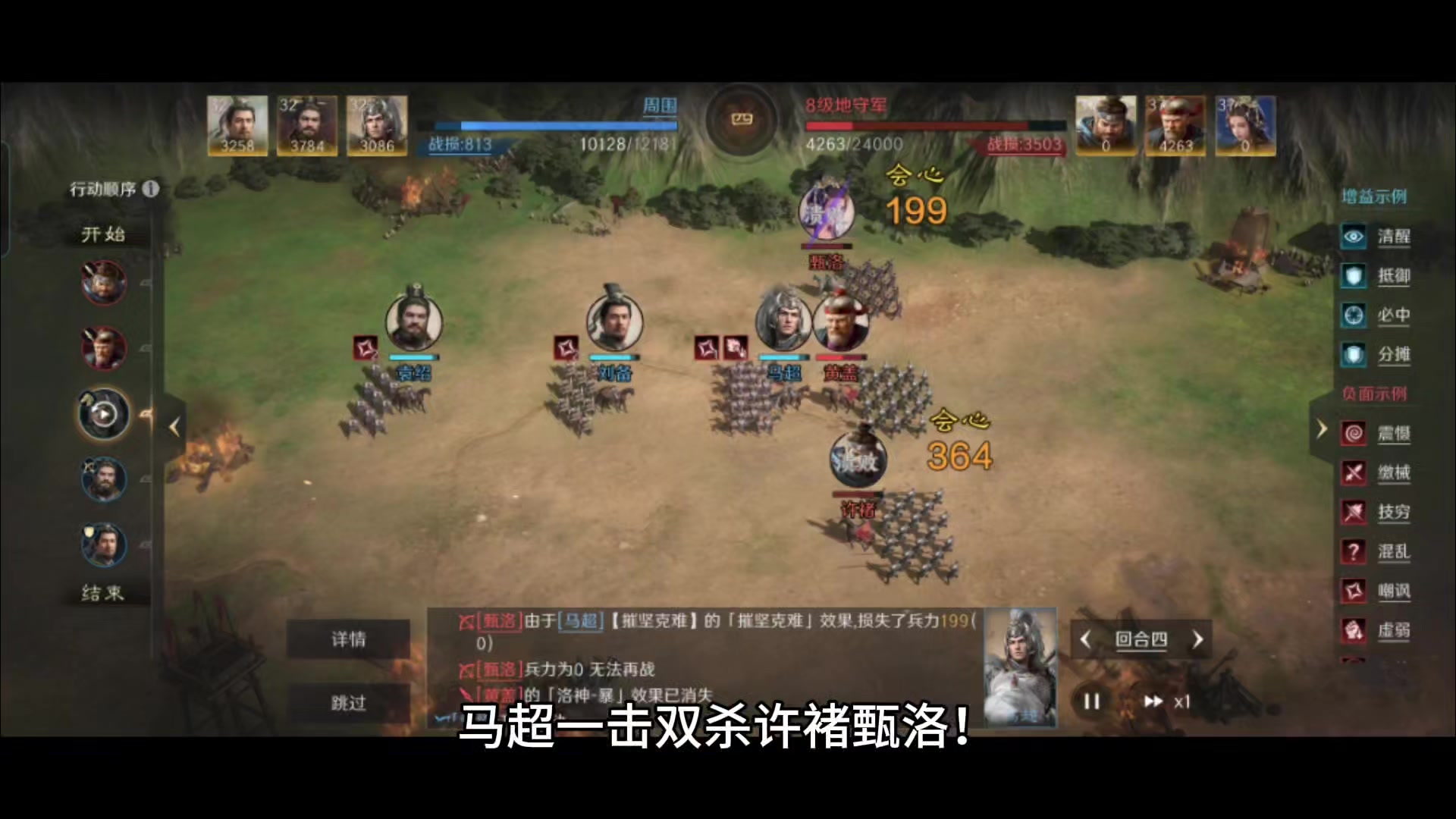 #三国谋定天下创作征集令 身处箕形阵前排的刘备,额外获得了6%的减伤保护,在携民渡江的基础上,后续习得了避其锐气和清风驱疾。韬略库的两本书,选择研读了大破残章和援道善本。 袁绍光是默认战法合集群雄还不够,第二战法还装备了指点乾坤,为的就是给马超进行精确制导,第三战法文武双全仅仅是作为输出的补充。韬略库里是两本小蓝书,分别为延智手抄和王道手抄。 身为本队伍里的绝对首席打手,马超必定要压轴亮相才能彰