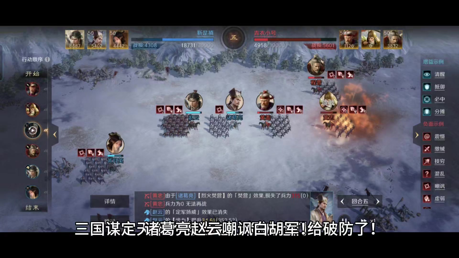 此战摆出箕形阵,赵云被安排到了前排,本就因为七进七出获得高规避的他,防御也得到了加强。第二和第三战法,分别跟进了威名显赫和锐不可当,身为全队里武力值最高的角色,子龙也确实应该扛起菜刀了。气临善本的嘲讽功能,开局先嘲讽三个老头过来普攻自己,好让诸葛亮和黄月英在后面搞小动作。 赵云都那么客气了,诸葛亮怎么可能不买账呢?草船借箭之后跟进狂风大作和烈火焚营,俨然是周瑜附体了!风助火势之下,对于敌人的杀伤力