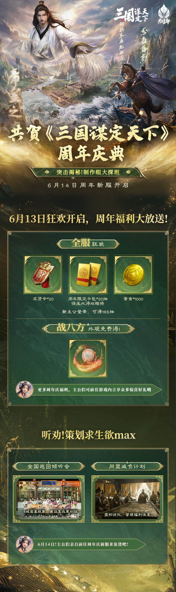 #614三谋周年庆新服 #三国谋定天下 #策略游戏 #三国slg 共执干戈,谋定天下!诚邀天下英豪入局,共贺三谋周岁,同写热血新章。 《三国:谋定天下》周年主题服于6月14日12点开启!烽烟再起,新服征战一触即发,沙场点兵,策略对决,谁能问鼎霸业荣耀? 开服在即,唐国强老师也为周年庆新服送上了祝福寄语,祝主公们所向披靡,再铸荣耀!