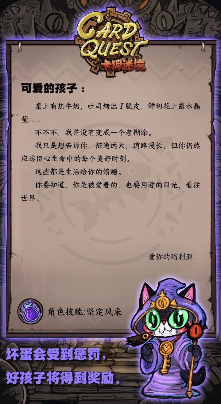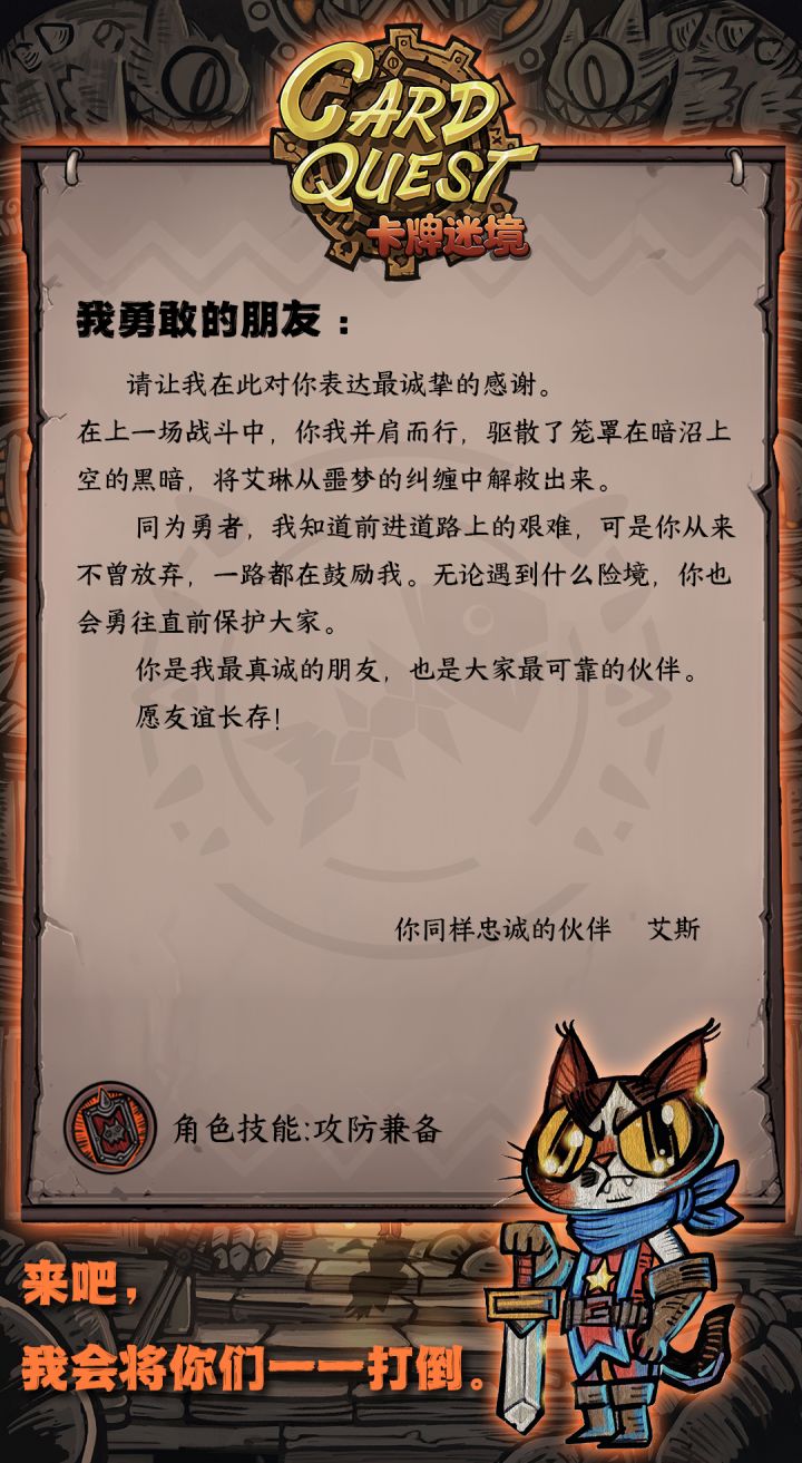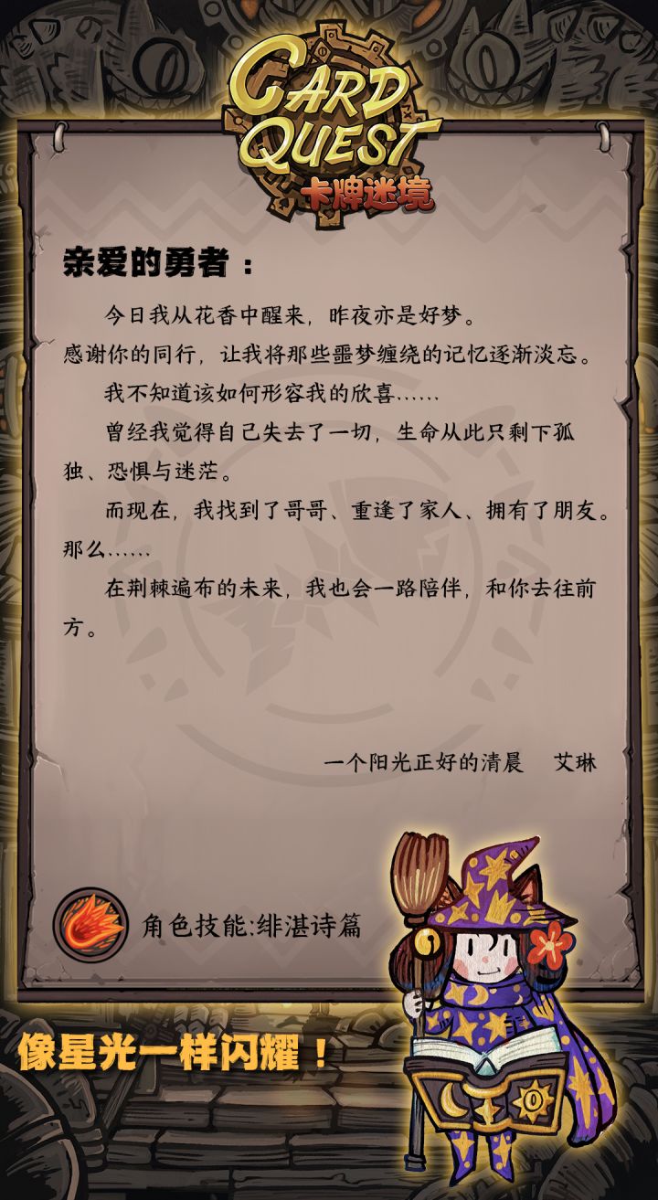 夜幕降临之际,那是艾琳痛苦的开始;在无数个噩梦缠绕的夜晚,艾琳一直祈祷着,希望能有一位勇士出现...能拯救深陷噩梦的她直到遇见了你,真正的勇士;你手持的利剑划破了艾琳充满恐惧的噩梦,宛如那点点的星辰,在漆黑的夜空中形成了夺目星河,指引了艾琳前进的道路;让她从此不再惧怕黑暗而今天的艾琳,再次从美梦中醒来,为勇士写了一封信感谢勇士大人对《卡牌秘境》的关注与支持,我们会在后续为您奉上来自不同角色
