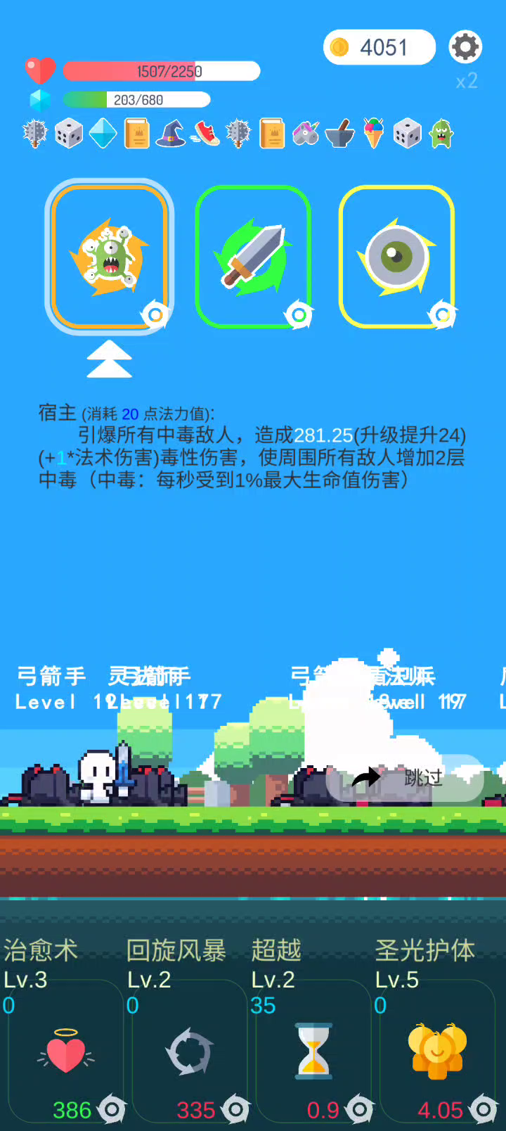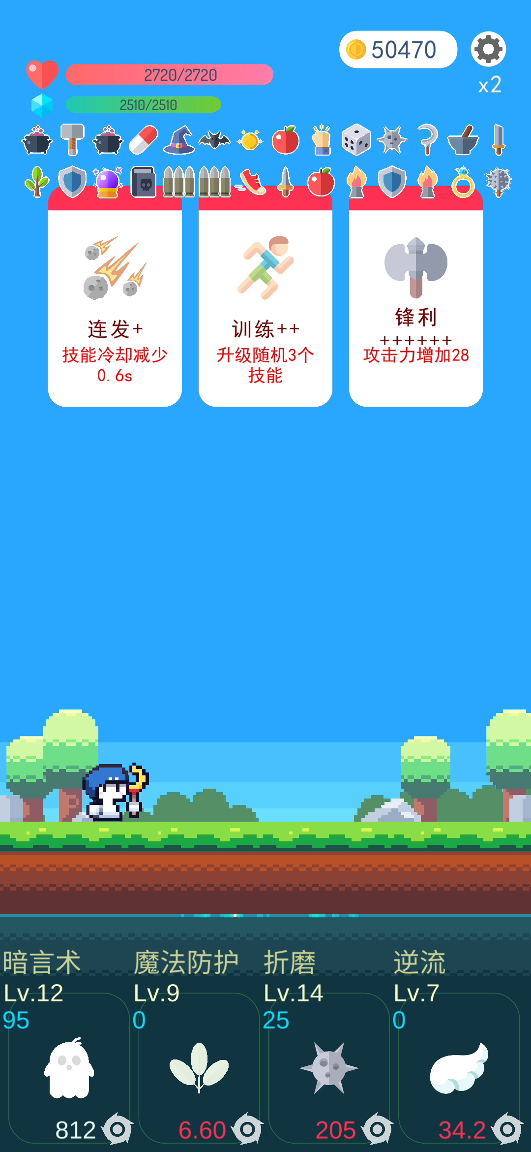 最强套路无限剑气 防御靠魔法盾,专职都选中间,攻击回蓝,和减CD收益加倍,被动也选减CD。达到主动技能无CD瞬发。输技能首选剑气可触发平A效果。其他任意输出技能都可以通关。但是没剑气爽。