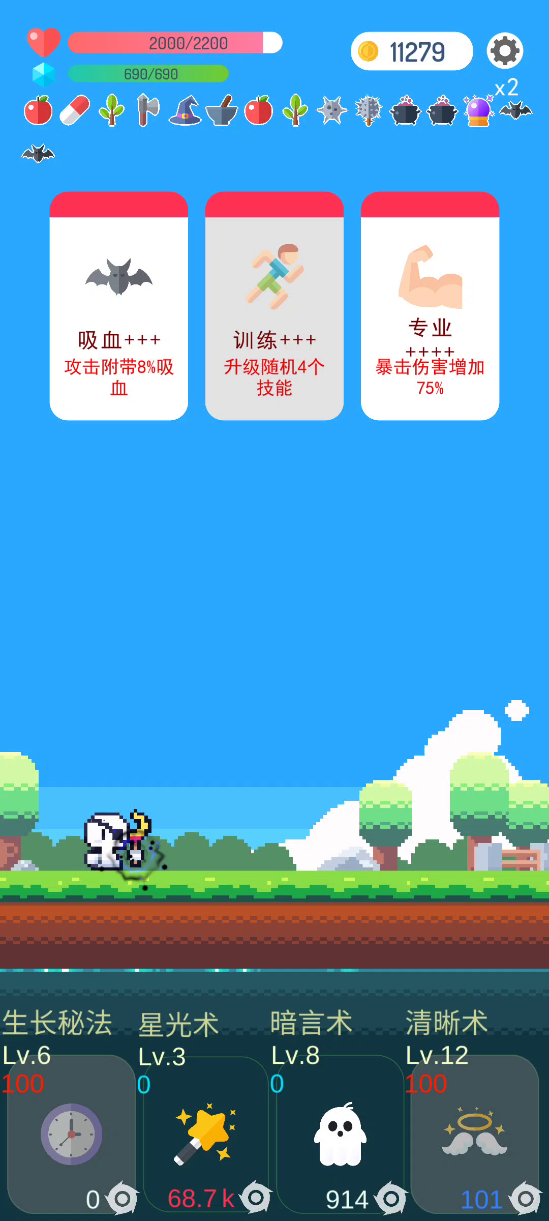 武器-初始刀-稳定吸血来源 副武-眼罩-反击回血 前期技能 衣服 回血 剑魂 拳套 开局有减蓝耗的话前面蓝量很稳定 后期技能 衣服 生长秘法 风力 棒棒糖 通关天赋选项 优先暴击> 吸血> 爆伤>攻击 有高级减蓝也可以拿一个,然后基本上可以无蓝耗过图