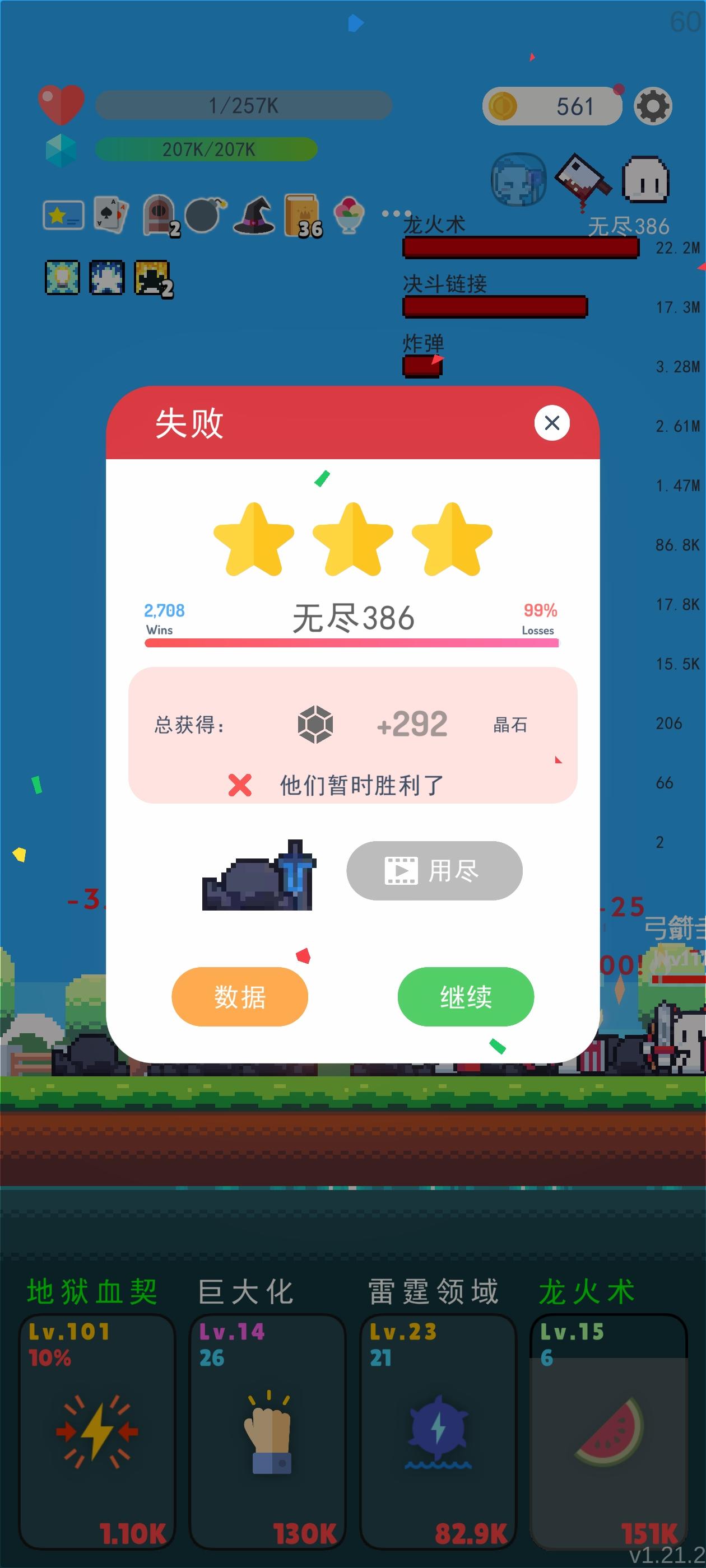 (配图与内容无关)这个游戏的内容是不错的,随机性还可以,但是最让人不能接受的是作者似乎不懂奖励机制。我打完一把无尽模式,玩了两个小时171层死了,然后你告诉我,我获得了156晶石?然后抽一次宝箱要400晶石?不是哥们,这就好比你去打工,你一天打6小时工,然后,用你这6小时工作得到的报酬给你的手游,只能抽一次卡???这个贫瘠的奖励机制你是在跟我开玩笑吗?现在有玩一天送一抽的手游吗?建议作者好