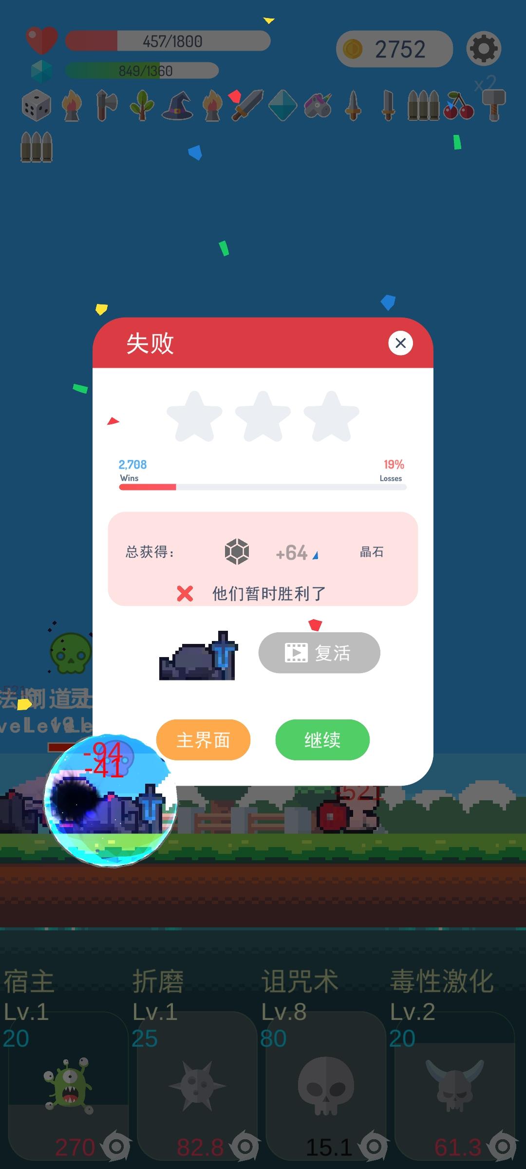 在难度不断增加的同时,我们的开局能力还保持在原地。甚至开局还多了个高耗蓝技能,自己实力难度还增大了,只能靠运气刷出好buff,这样只会出现两个极端,要么打不过,要么运气好打过了。没有中间的努努力就能打过。这样靠运气不断的重开刷buff,刷多了就腻了。总觉得这样对于游戏的发展来说不是什么持久之计。现在好了,新增了个复活广告。所以是广告增强实力咩,哎。希望下个版本有所改变,弃坑先。加油。