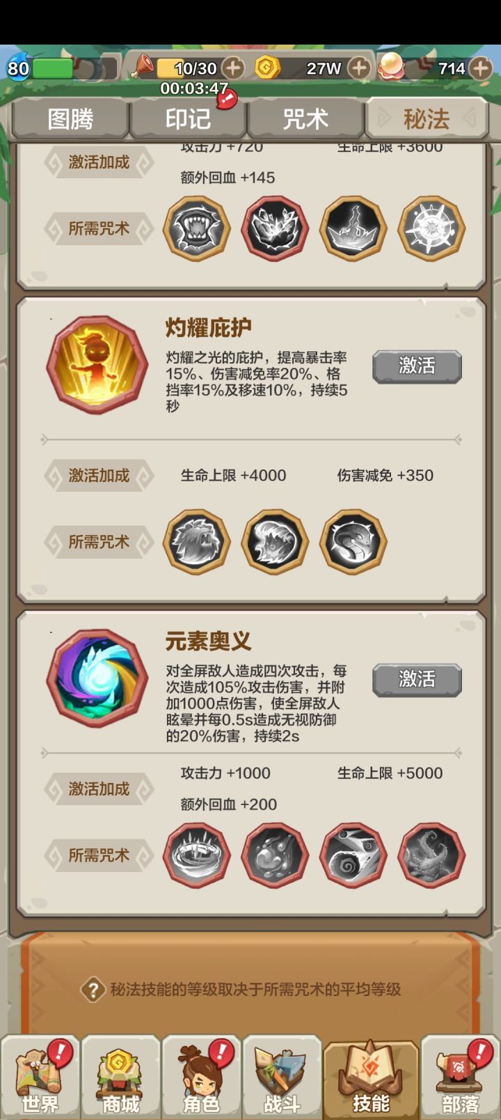 哈啰勇者们好呀,经过这段时间的磨砺,大家的战力是不是有了不少提升呢?说起狩猎的战斗,除了平A普攻,咒术更是不可或缺。除了之前说的那些基础之外,还有不少进阶的内容,今天我们就继续上次的话题,来说说咒术的进阶内容。在前不久的版本更新中,诞生了一种咒术的进阶形态——秘法。特定个咒术可以合成一个秘法,威力更强,和咒术一样的使用方法。目前对于大部分玩家而言,前四个部落技能(沙漠侵袭、虎爪连击、血脉沸腾、风