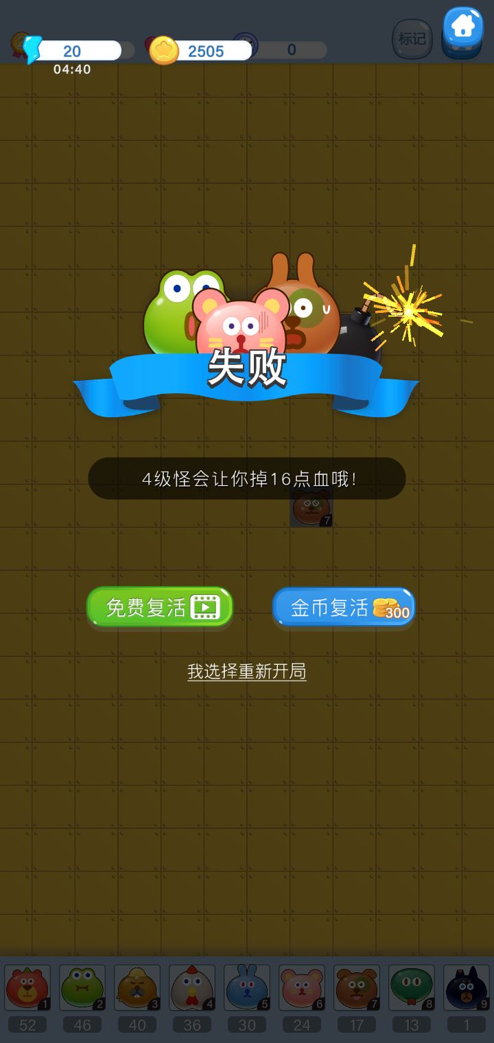 2,可以考虑增加"升级"功能,用金币买血?但是好像普通模式中,各个难度的血量不一样?要么调成一样,要么是基础+购买。。防止膨胀,可以购买难度大一些,很多金币买1滴血量。为了增收,举例每4-6滴血可以看一次广告😁。。初期可以看广告直接拿血量,但这个需要一个上限。。玩的久的人,在初期的容错就大了,尤其是每日一次的地狱模式,哈哈哈哈 。增加玩家的耐玩性。。。容错机制多了,就可以开发更大攻击的怪物。。现有血量10,随便一个5级怪物就挂了,配合严苛的经验条,在中期会有功亏一篑的感觉。当然也可以买复活,但是成就感不如一步到位。。
