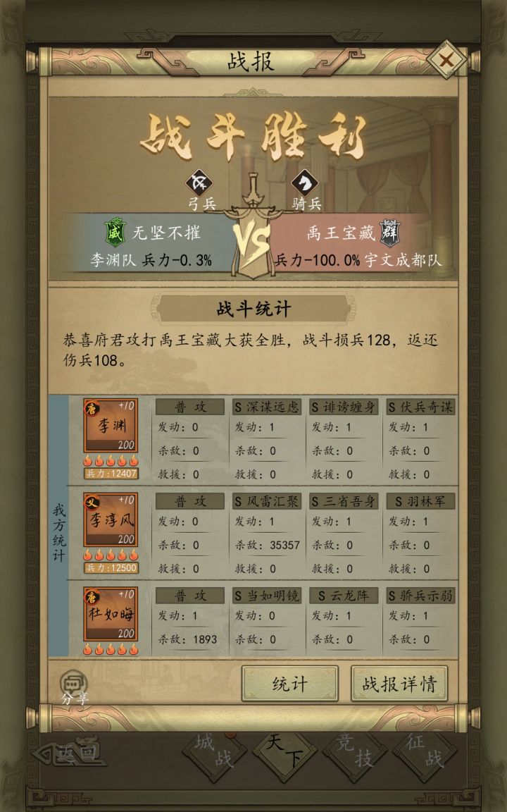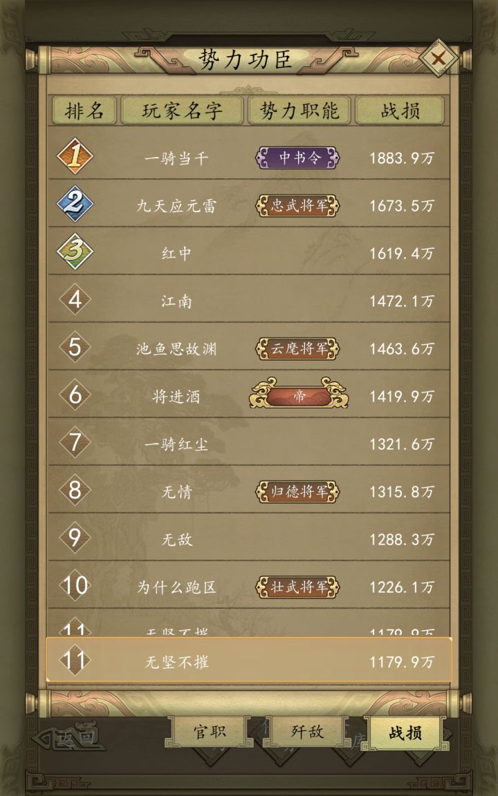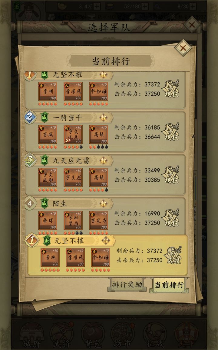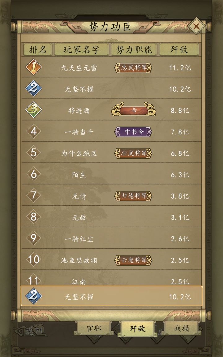 本阵容采用秒杀系主c武将“李淳风”、“杜如晦”,搭配辅助武将李渊,有几率在第一回合就触发双c秒杀技能,单个c杀敌数为2w兵左右,若触发暴击更无解,华佗也救不活对面。武力队智力队通吃。本阵容最大的特点就是3智将,优点是不用点武力将魂,纯智或者纯武将魂,再叠加统率速度都不错。就连爆头天下无敌遇见该阵容都得被秒杀。最后两图是杀敌及战损情况,新手打架与开荒的利器:战损排行倒数第一,杀敌排第二。此为