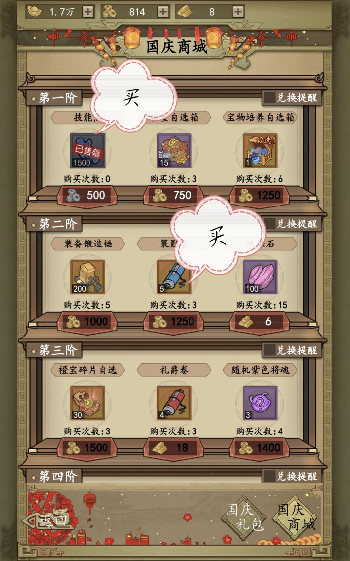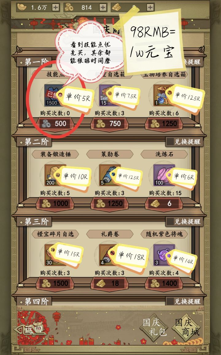 ①98RMB=10000元宝,10R=1000元宝。②100锻造锤的市场价是300元宝,200锻造锤的市场价是600元宝,而10元等于1000元宝,此刻,每个单价血亏400元宝!若是买五次,那么血亏2000元宝。③礼贤在寻宝活动是120元宝,与此相同,因此是等价可买。④红券4个是1800元宝,而洛阳寻宝是200×4=800元宝,贵了一倍还多,买了血亏。⑤橙宝碎片:寻宝活动是20碎片=500