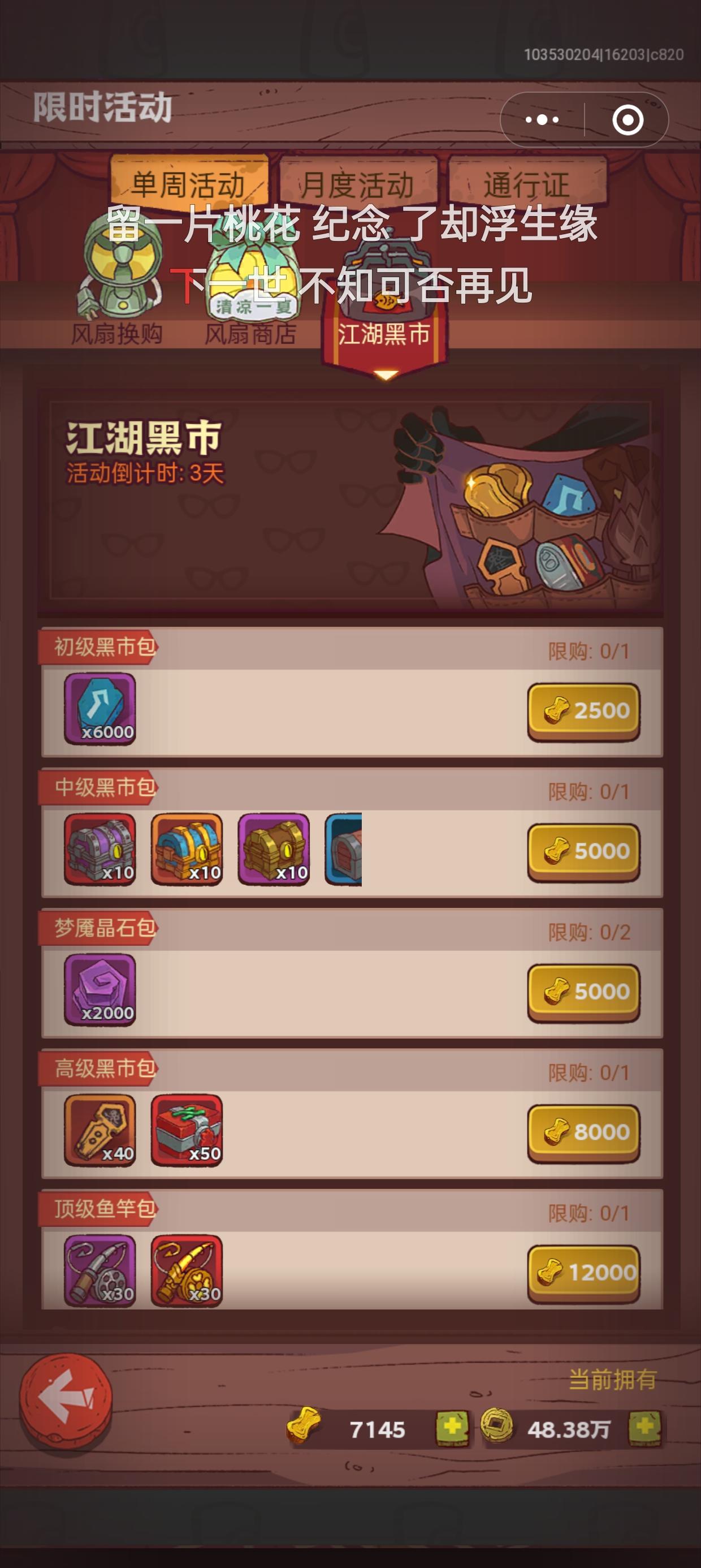 现在正常做周常,中秋悬赏只做鱼竿和四轮宝箱,大概能在周年庆活动中吕布毕业(算了算资源差不多够用,不过那时候鱼竿应该用完了)吕布毕业以后,爬塔得到的招募存着,同时开始屯鱼竿,为元旦悬赏做准备,约两个半月的时间,能否屯出金鱼所需资源,如果不行,那请问氪金拿金鱼竿性价比最高的方法是哪个