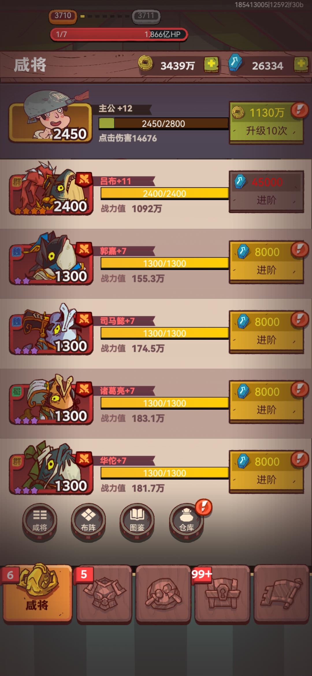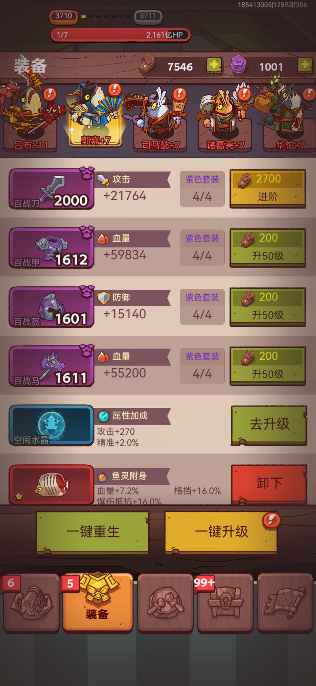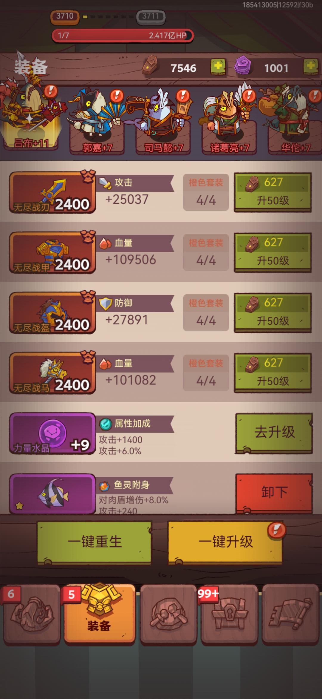 爬塔52-10遇到瓶颈了,进阶石也不足。装备提升效果不大,没有灵鱼。现在进阶石用来升挂件还是等着筹够升吕布。