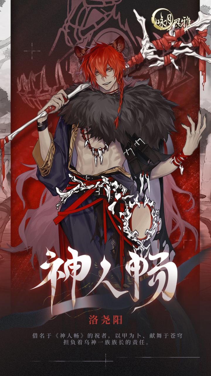 点击加入→祝者档案已共鸣★日级祝者:神人畅「洛尧阳」·(协)★化灵之日:12月11日★星位:尾宿★身高:191CM★职业特性:战意变换、范围强化★角色介绍:借名于《神人畅》的祝者,以甲为卜、献舞于苍穹,正是他作为乌神岛祭司的天职;而作为乌神一族的族长,他主动担起保护全族的责任,以野性为骄傲,为部族披荆斩棘开辟前路。★神予:「激励」洛尧阳可以治疗主要目标及其四周范围内的所有友方祝者