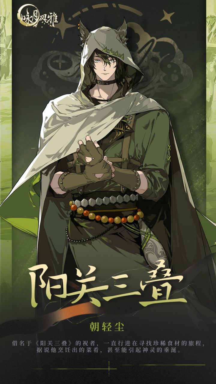 点击加入→祝者档案已共鸣★月级祝者:阳关三叠「朝轻尘」·(垒)★化灵之日:6月29日★星位:奎宿★身高:183CM★职业特性:近战、生存★角色介绍:自化灵诞生之日起,这位借名于《阳关三叠》的祝者,便踏上了寻找珍稀食材的路途。他有着得天独厚的厨艺,更有流言称他烹饪出的菜肴,甚至能引起神灵的垂涎。可惜他的旅途总是无人相伴,因此,他形成了沉默寡言的性格。而他本就为数不多的话语,只有在面对