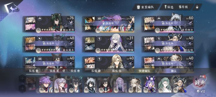 真的卡了好久好久,去搜攻略也好少,终于看到一个还不错的提升说打这关近战,奶妈,群攻,远程都需要,所以用了图2的队伍,两颗星勉强过,中途差点以为会噶,还好硬生生刮过了,虽然需要打到三颗星才能重复刷材料,但是至少能过到第六章了#攻略#主线通关