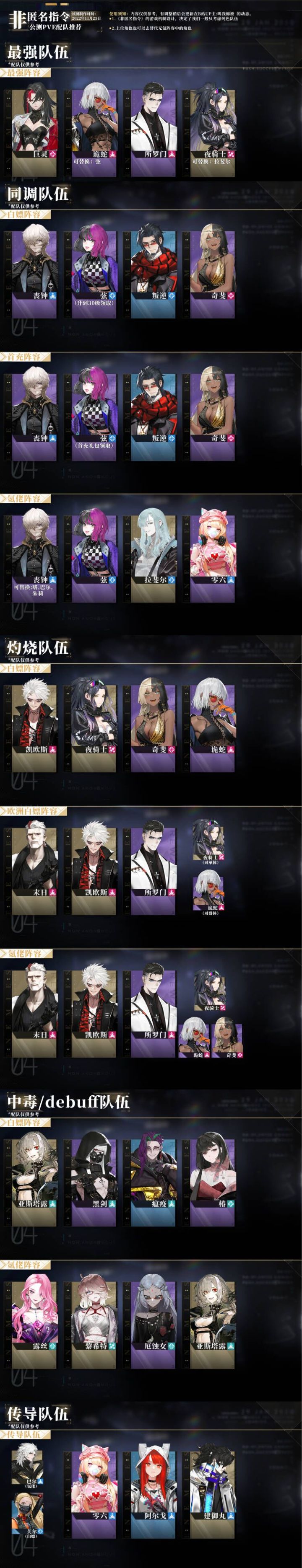 非匿中的机制还算是蛮多的,不同的机制造就了不同的队伍玩法,下面为大家带来几种不同机制所组成的队伍,都是面向新手进行开荒所推荐的队伍。在游戏大环境中能够使用一段时间,短时间之内不会退环境的那种,还算是中规中矩。写在文章前面,不管是养什么队伍,辅助都很重要,不管是什么输出都是要带辅助的,而且还不止一个辅助,所以辅助练的多,拿的全,整体游戏玩起来才舒服。队伍推荐首先先把推荐的几个队伍罗列出来,它们