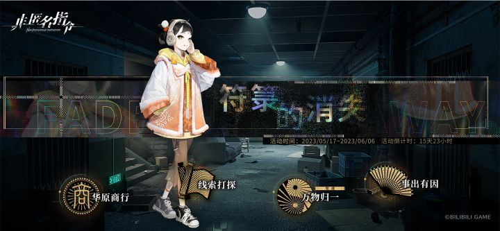»»»LOADING - 未知信号接入中»» 讯息来源「三清会」== 「符箓的消失」限时活动 情报解锁 ==昏暗的灯光,空无一人的地下室。不幸坠落的符箓,找不到的出口。黑影不希望你离开。帮帮符箓!逃出生天!>>活动时间玩法及活动商店开启时间:2023年05月17日 5:00 ~ 2023年06月06日 5:00。>>参与条件代行者需开启组织合作功能。>>活动说明●活动期间将