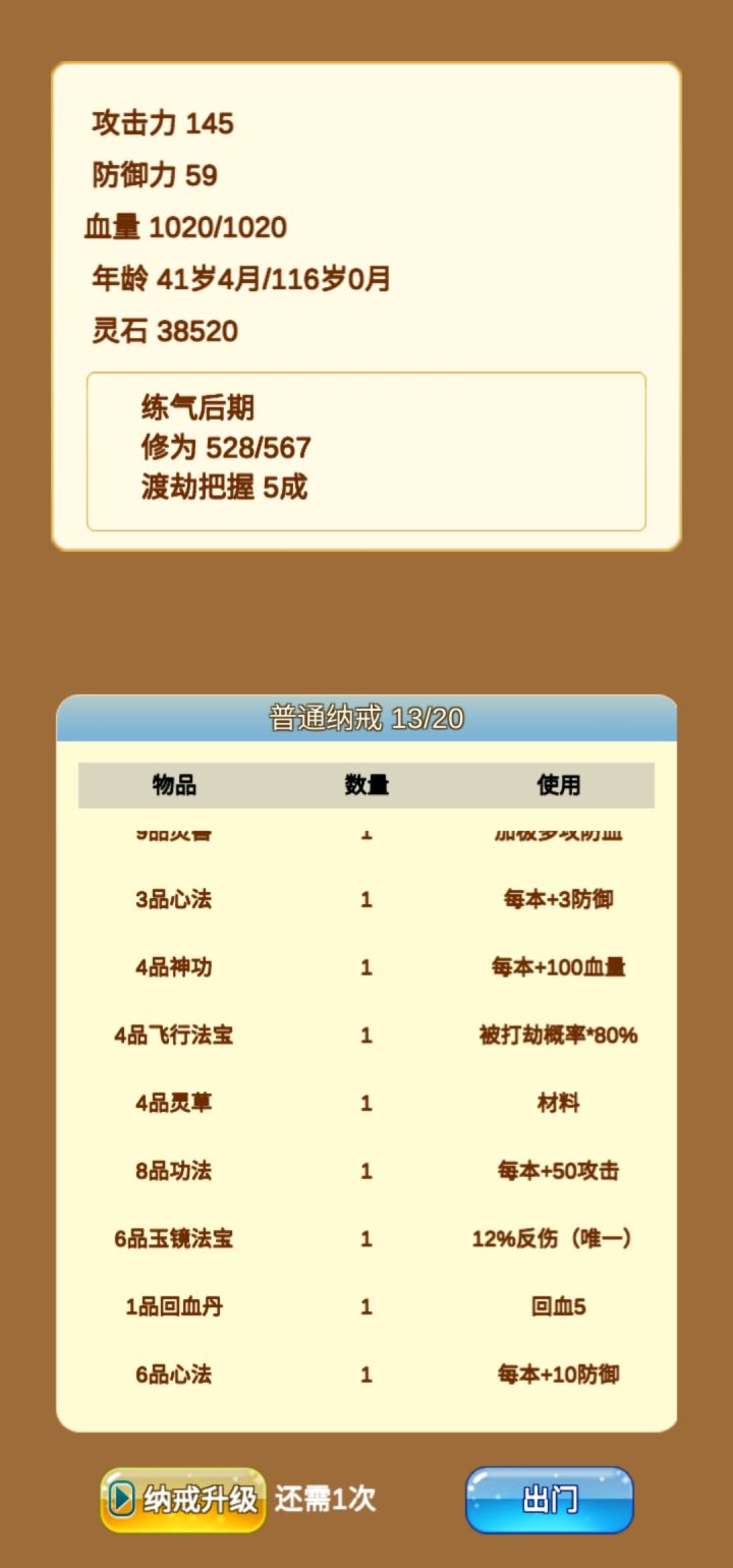 攻略: 不看个人建议前期看一次突破丹药的广告,然后把所有丹药卖掉,开始买卖作战 有人打劫你就给他钱 别想着提升实力打赢他,这太拖节奏了 你要正常玩估计要玩好几天,但是极限卖东西两个小时就能通关。 反正就是低价买高价卖