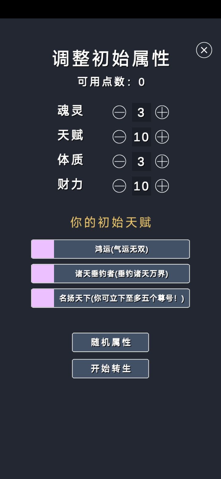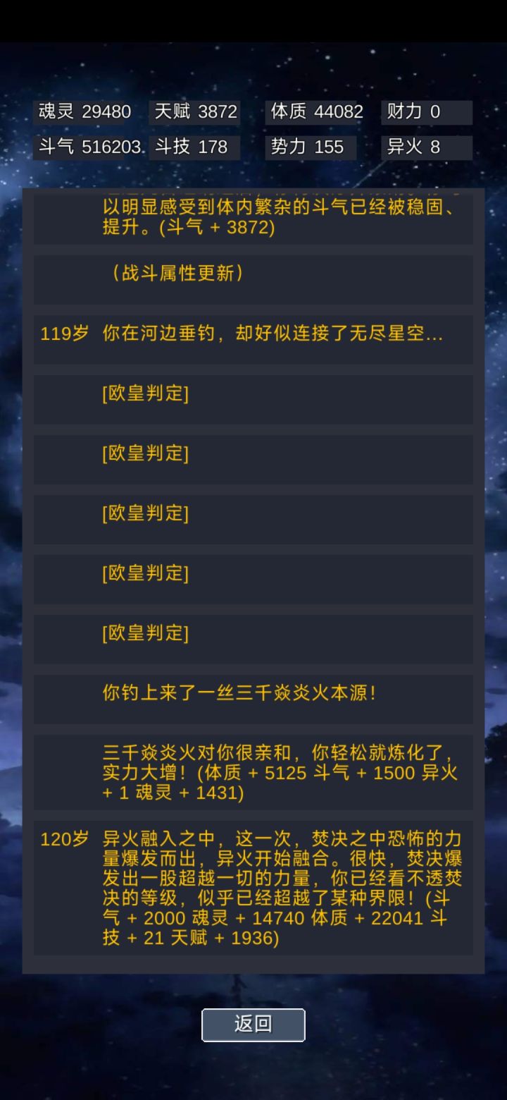 我只能说鸿运+垂钓+焚决真的无敌,名扬天下在这三个面前真的是弟弟,这连携效果太夸张了,钓鱼几次五星欧皇出的三千焱炎火都能被焚决吸收,导致最后焚决能突破天阶斗技开始成帝。而且鸿运起来欧皇判定就没下过3次。体质灵魂完全不缺。前期斗帝血脉加无上斗气比较好用,迦南学院剧情各种考验随便过,最好有一个比较保险。开局加点要把财力加满,其他的随意。还有就是我试了很多次,成帝对