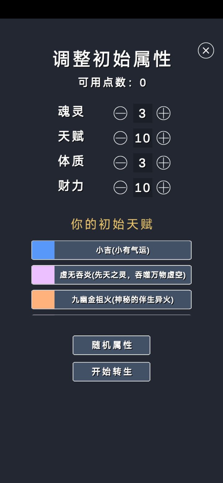 1. 开局加属性时尽量将两个属性点满,因为开始随机灵根之类的会扣除全属性5点,全点满可以得到最大加成。2. 更新通知看了之后会得到1296个灵石,灵石来得最快的一集。3. 十岁之前必须突破凝气不然会寿元枯竭。突破凝气只有5次机会,前四次可以压制,第五次必须突破。(先催动,再反转)若开局是天灵根或五灵根在全属性≥30可以点两次反转,之后选更进一步,后面全选左边,可以获得一个阴阳阵。4. 之后