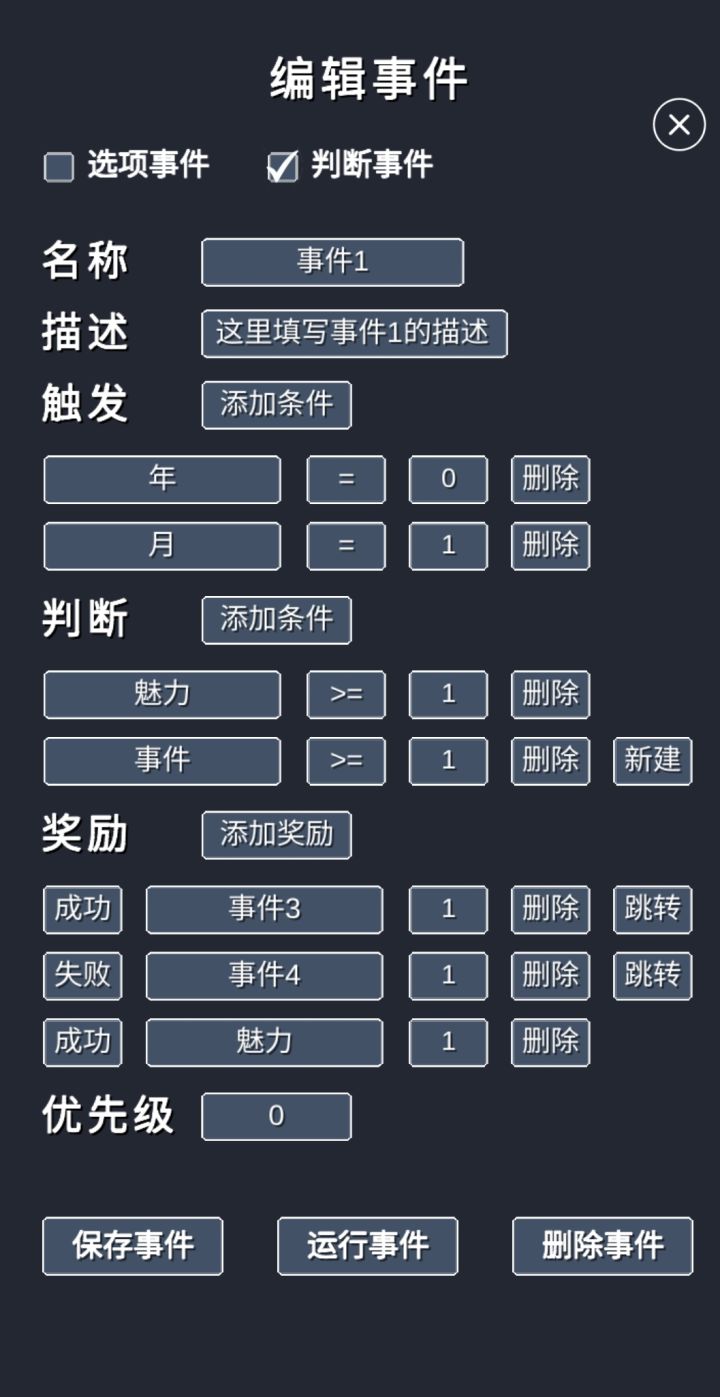 下面继续介绍事件系统,介绍其他一些属性的意义和操作。1)优先级。优先级是指一个回合内事件发生的优先级,它的取值是零到正无穷,可以任意设置。这里,一个回合是指在这一年或者这一月所有可能发生的事情(到底是年和月取决于你现在的时间尺度)。优先级高的事件一定比优先级低的事件先发生,也就是说,如果在这一个回合内,你编写了两个可能发生的事件,一个优先级取1,一个优先级取0,那么只会发生优先级1的这个事件