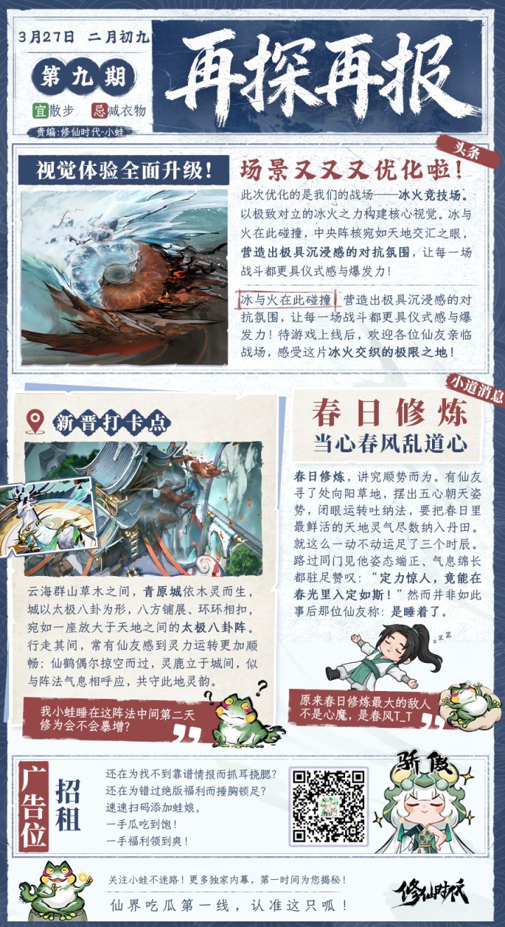 仙友们中午好!小蛙又带着新鲜热乎的情报来啦! 冰火竞技场优化,战斗体验大幅提升,沉浸感直接拉满!春日修炼趣事频发,避坑指南同步奉上——速来跟小蛙一起看看本期独家爆料吧~ 本期看点:◆【仙界头条】冰火竞技场上线,战斗体验全面升级!◆【新晋打卡】青原城太极法阵,御剑踏云好去处! ◆【春日修炼】修炼奇闻趣事,春风还会乱道心?!关注本报,掌握最新资讯! -------------------
