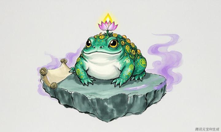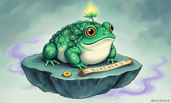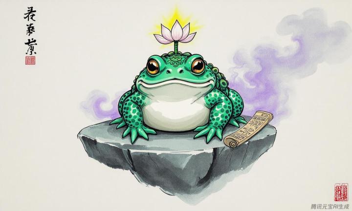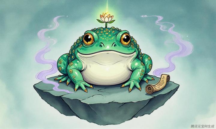一只极度夸张的碧玉蟾蜍,体型肥硕鼓起如球,巨大凸起的金色复眼炯炯有神,头顶生长一株发光的迷你仙莲,皮肤覆盖闪亮的铜钱状鳞片与凸起的神秘符文毒腺,蹲坐在漂浮的巨型青石上,口中卷着仙侠卷轴,脚下缭绕紫色毒雾祥云,背景是云雾缭绕的悬崖仙境#修仙时代 #ai修仙工坊 #小蛙生图创作