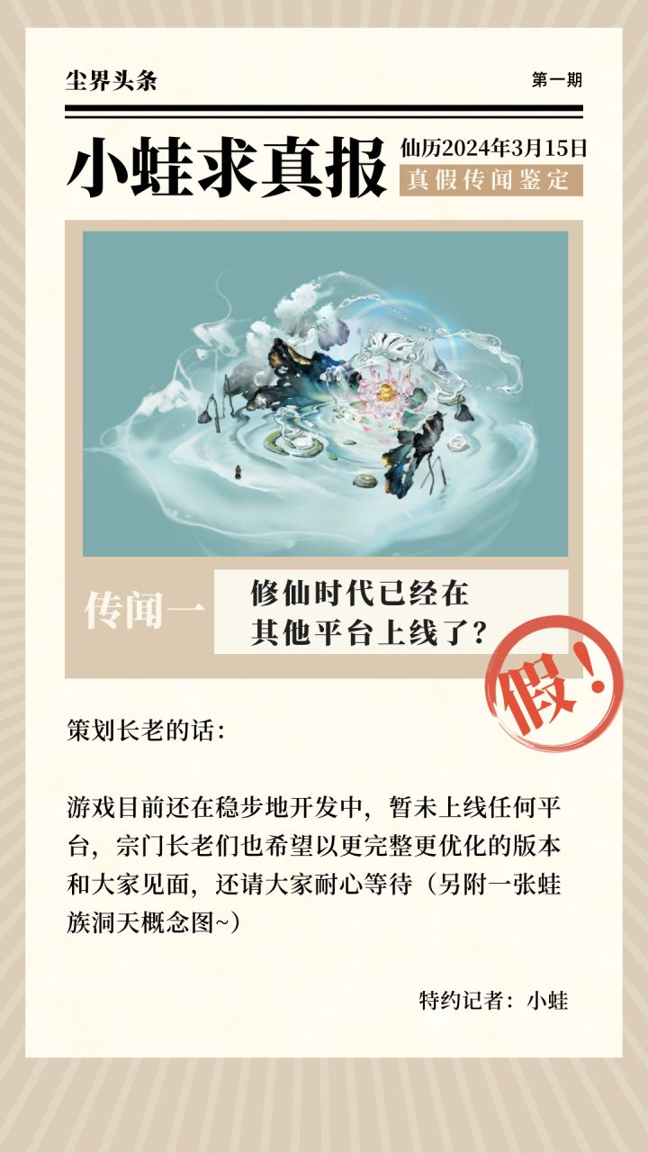 最近关于咱们游戏一些似真似假的传闻在各宗门间流传甚广,小蛙也是深切感受到了各位仙友对于修仙时代的热情。那么在一年一度的315之际,小蛙记者“重拳出击”,来对这些传闻做个真伪鉴定!下面请看报道:传闻一:修仙时代已经在其他平台上线了?传闻二:游戏内的战斗方式只有远程攻击吗?传闻三:寿元相关的玩法会进行优化?传闻四:游戏会是买断制吗?传闻五:可以同时拥有多个道侣?作为一名求真务实的搬砖蛙,为