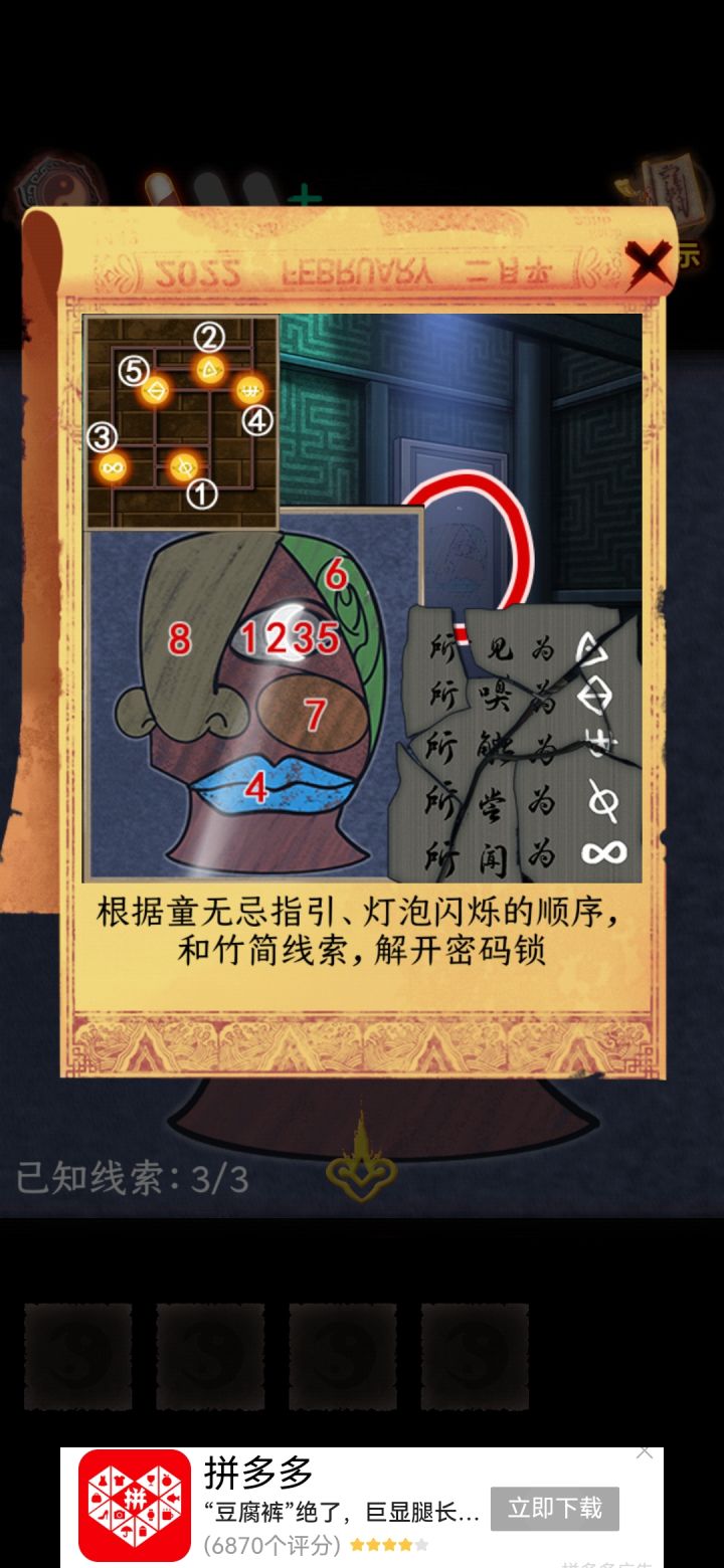 攻略作者:迷失攻略组-路人A未经许可,禁止转载,侵权必究!第三章36.翻看书本,得知破除法阵的方法。36.137.拾取【长钩】、【锤子】、【空香炉】。37.138.完成石碑的机关,得到【凿子】。38.139.用【凿子】和【锤子】撬开地砖,得到【童无忧牌位】。39.140.放入【童无忧牌位】,根据线索调整牌位位置,得到【钥匙】。=====================字辈按照“清
