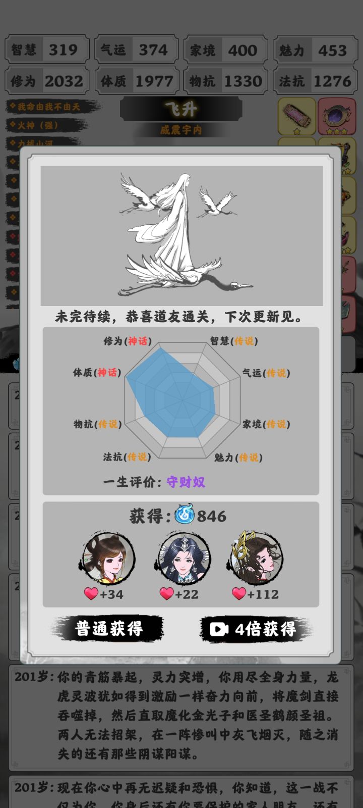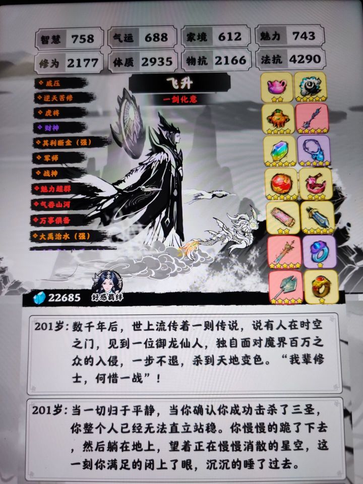 我193岁时飞升,200岁还没飞升的话容易被剧情杀,飞升后体质扛伤有10万,再抗个五行伤害,之后随便点点,反派死了就通关了