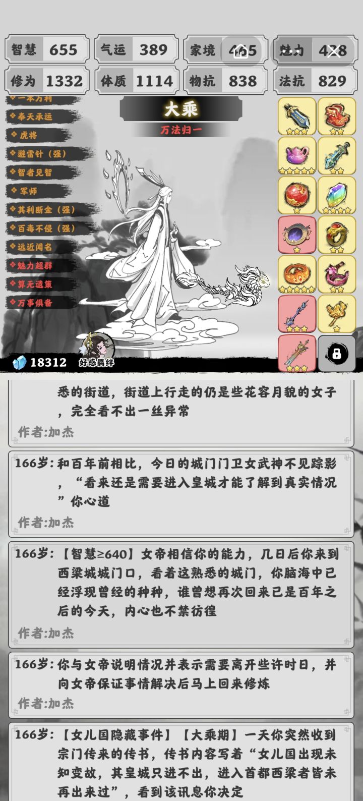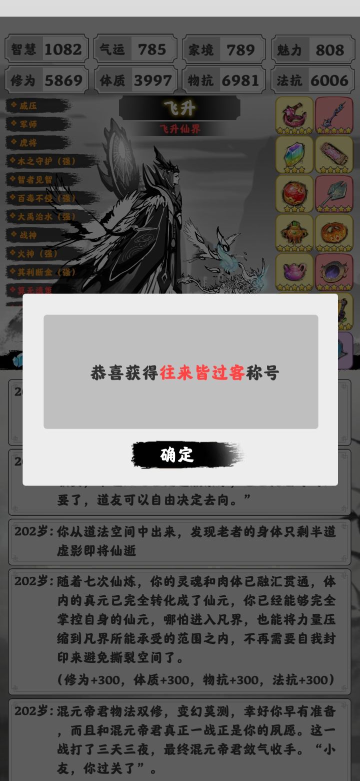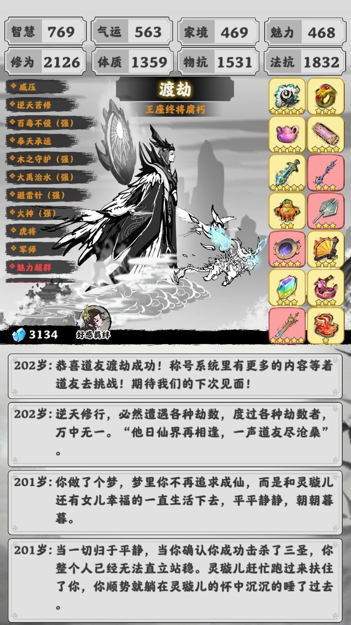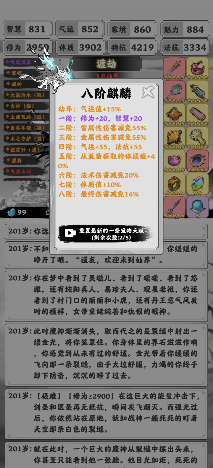 第一次解说有不对的地方欢迎指出。注意152毒抗90+,197雷抗100,200后补够90+火抗。200岁修为要有2620+,智慧640+,魅力最好有800+能吃到500体质。顺便也可以吧完美飞升拿了。选接受考验,不要给钱。被雷劈中大退游戏再进又可以重新开始躲避天雷。