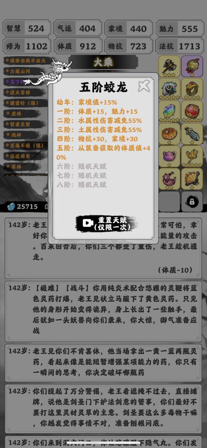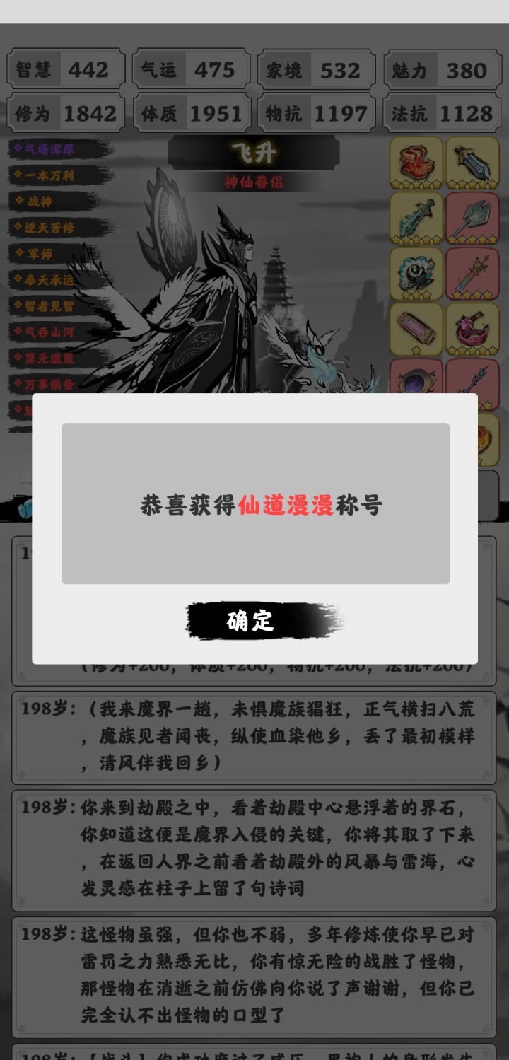 我本以为更新后会容易通关一些,然而,现在每次轮回都要看30秒广告才能获得强化,而且就算有强化你也得背剧情,以便提前准备好某种属性的抵抗装备,否则随便来个战斗就把你打回轮回。垃圾游戏,看广告都过不了,不看广告岂不是必死无疑?不好玩,难度基本都卡在战斗准备不足上,浪费时间,剧情单一,不背诵剧情,一路莽过去,总有一天会遇到你莽不过的敌人,容错率太低,战争是没有赢家的,要是我修仙,一定是欺软怕硬,猥琐发育,谁会老是凭修为高就到处惹事?早晚踢到铁板,我卸游了,最后给想通关的人一个建议,把死亡战斗背下来,下个轮回提前准备抵抗装备,多轮回几次,就通关了。这游戏既简单又很难,只要一直战斗不被打死,就能通关,不存在寿元耗尽无法飞升的问题。😩