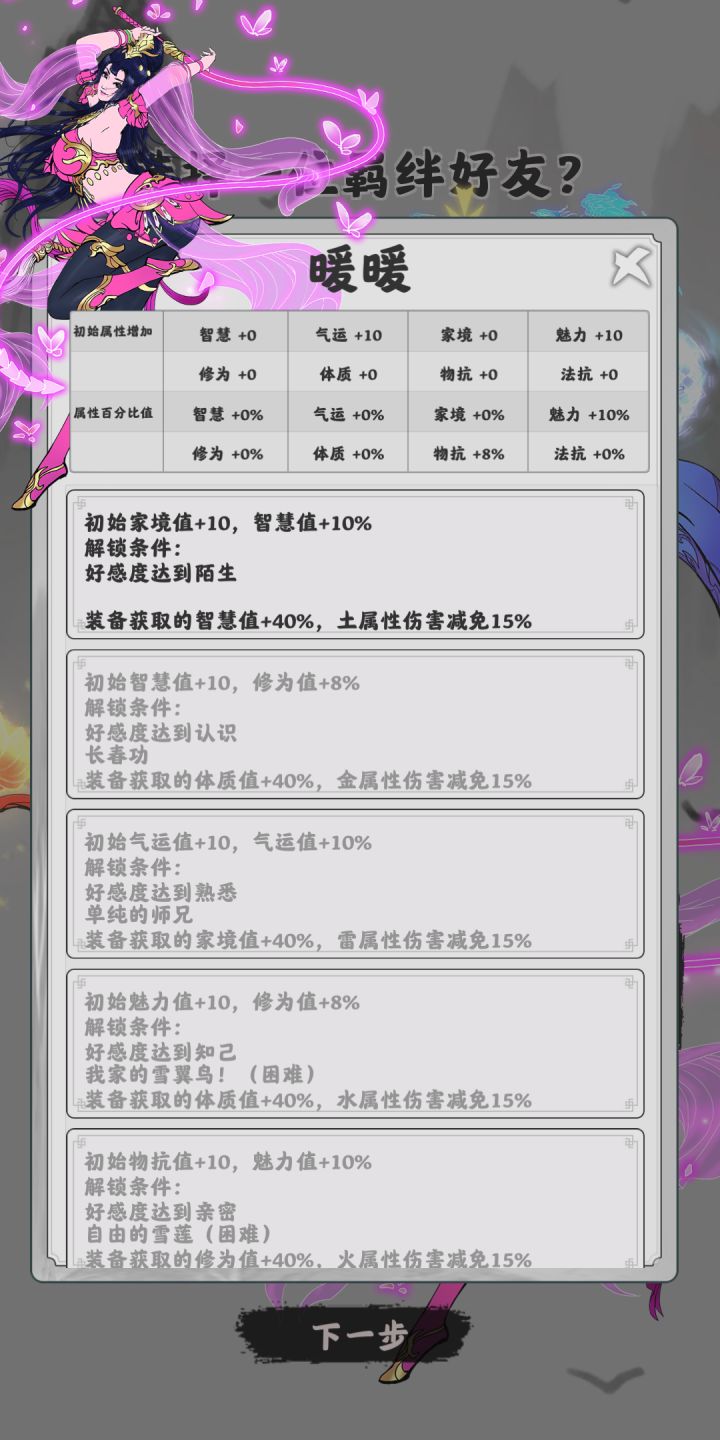 希望能够增加一下一局下来好感度的获取。现在在获取万法归一称号之后,基本上就是机械的刷好感才能够使自己实力有较大幅度增加(等级提升缓慢不足以改变结局)。希望能够提升一点好感获取,减少这部分机械操作的时间。