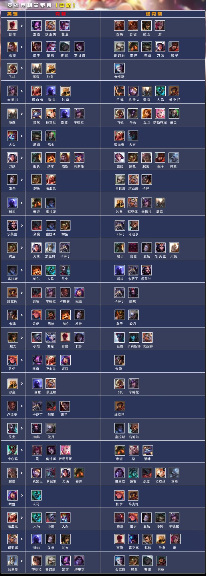 大家好啊,沫酱又来更新啦,大家期待的BP克制关系中路篇来咯!本系列攻略整理了游戏中各路英雄的克制关系,在BP环节中选取克制对面的英雄可以获得战力加成,也是一场比赛中较为关键的决策点呢,还不熟悉BP机制的萌新经理们学起来吧~接下来上正片,中路克制关系一览表奉上↓ BP克制的中路篇就是以上这些了,后续位置慢慢补完,感谢大家的支持~上路篇、打野篇及更多攻略戳我头像进主页了解~