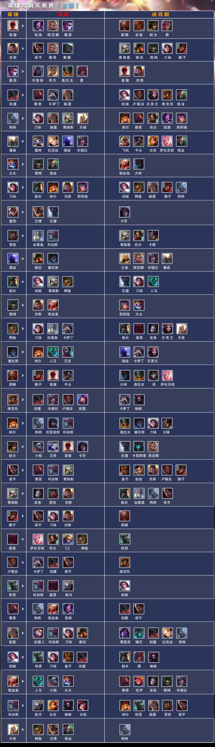 今天来给大家盘点一下比赛中各路英雄的克制关系,帮助大家能快速的了解游戏英雄BP机制,更加容易上手游戏~每个英雄都有他对应的counter位和被counter位,我们在BP阶段需要注意到这层羁绊,选取克制对面的英雄可以获得战力加成,能在战力相近的对局中先占上风~那么游戏中各路英雄的克制关系是什么样的呢?来,我已经给大家整理好了,往下看~这期先给大家展示上单之间的克制关系,后续会逐渐补全其他路,