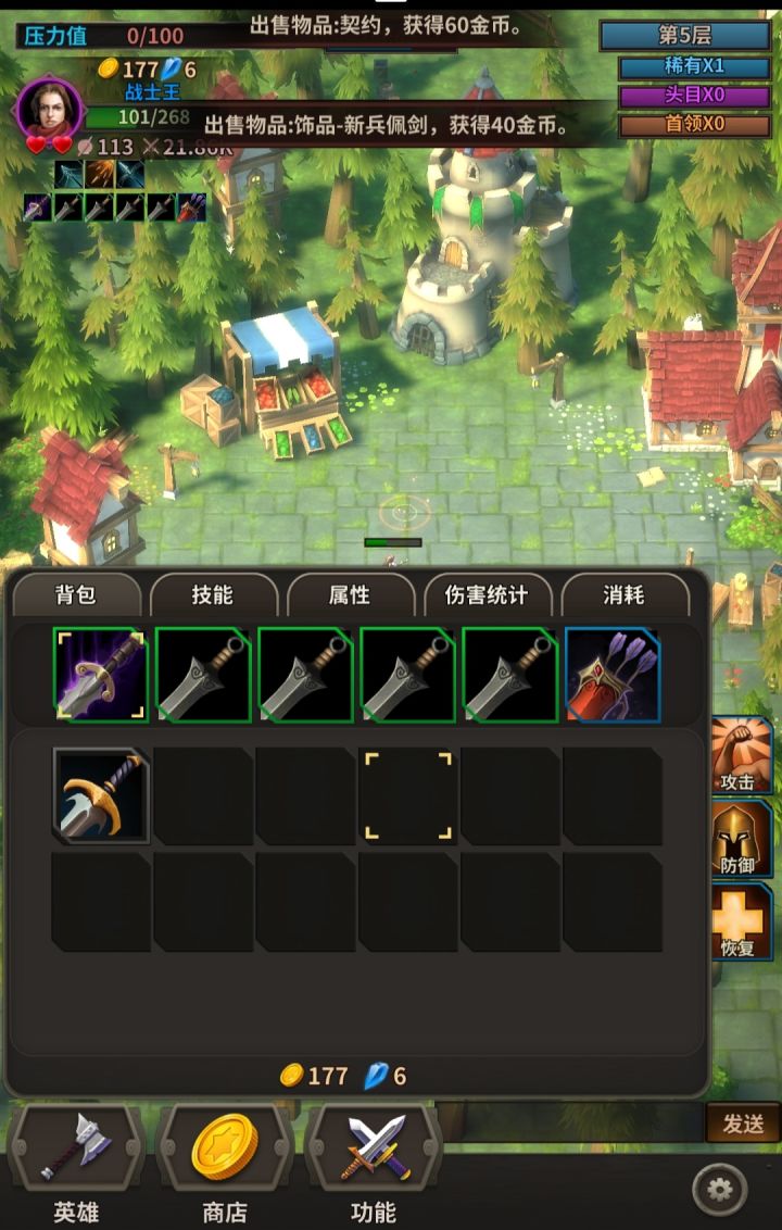 职业:目前新手有三个入门角色,战士法师弓箭。目前我个人来看,应该是战士>弓箭>法师。也可能是大家还没玩明白啊,仅供参考。进入游戏:主要是装备和技能,人物几乎不需要操作。装备方面,分为五等装备,装备之间采用的是合成进化的方式。除了在商店中购买,野怪也有一定的几率掉落装备。很多新手玩家喜欢无脑堆输出,其实并不合适,需要适当的出一些防御,站得住才有输出。胜利有两种方式,一种是对面扛不住了,两条命都用