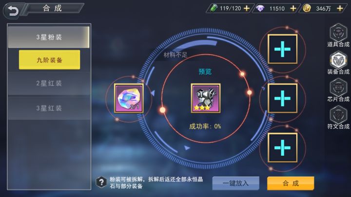 尊敬的玩家们:《火线出击》是一款原创近未来科幻风格的RPG+TPS游戏,游戏中有所有的装备都是靠副本和BOSS刷,也应证了装备全靠捡,我们一贯的口号,说到装备,之前给大家介绍了两星装备的合成和三星装备的合成,也由于游戏的持续更新和副本退关需求,三星装备已经无法满足玩家的需求,今天给大家介绍一个装备合成的高级形态--粉装合成。粉装合成是要求三星九阶红装,还是按照之前的规则,三合一,不过粉装的合成