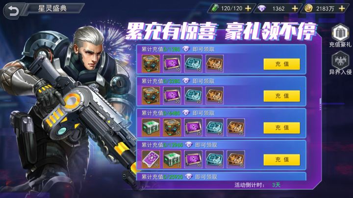 尊敬的小伙伴们:《火线出击》是一款原创近未来科幻风格的RPG+TPS游戏,作为双料加持的特别游戏,有些游戏活动跟大家提前透漏一下。除了常规的关卡设计,BOSS击杀,以及之前介绍的游戏试炼(极速狂飙、佣兵试炼、守护试炼等)今天跟大家分享一下一个新的活动----星灵盛典!星灵盛典包括充值豪礼和异界入侵。充值豪礼是应大佬需求,分发点福利,基本上是0门槛,微氪金。异界入侵则是全民狂欢的项目,获得