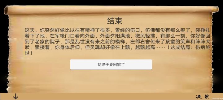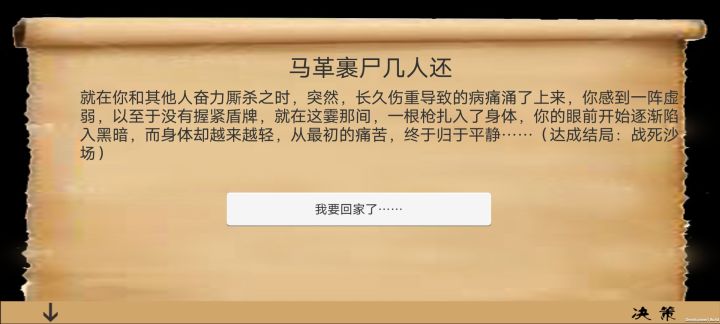 一个建议是,有没有一个物品栏什么的,我都不知道我有什么没有什么一个疑惑是有哪些结局,目前我三个,衣锦还乡,战死沙场,病痛死亡