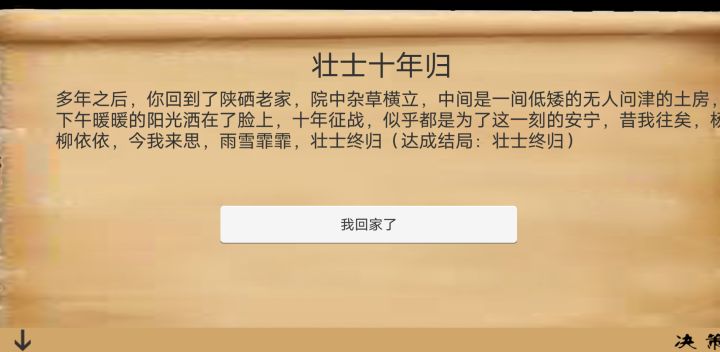 学成归来,总共解锁了四种结局:两种不好结局:伤病终世和战死沙场 两种好结局:壮士终归和功勋万代。嘿嘿嘿,貌似一直逃跑也是一种结局,但每次都因为没有一技之长被送回来😉,(虽然积攒了居多脚力吼吼吼)。一直积累财富会不会富甲一方呢哈哈哈,大胆猜测.jpg☺ 总之可玩性还是挺高的。