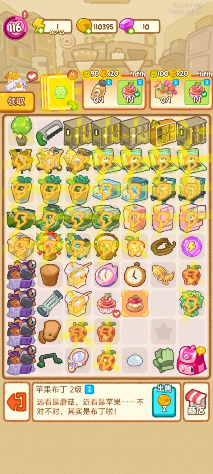 九,元素球,能量升紫再用,剪刀尽量留一把最高级的备用,+货数的尽量给超市,无限能量可以有就用,也可以升级再用,最优是等红桶和工具箱冷却好了再点,格子提前清出来,对自己手速有信心的步数给超市等一会之后,开2分钟无限能量,工具箱,红桶,超市之类的一路点过去,空格子越多,无限能量利用率越高!
