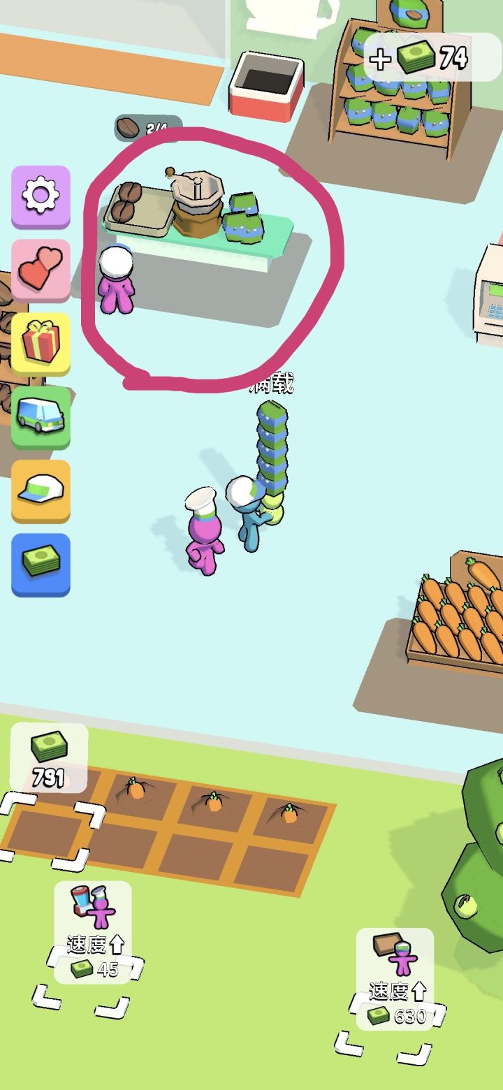 游戏有bug,我的员工本来是应该会拿那个咖啡粉放在货架上的,但是他每次都走不到那个位置,拿不到东西,就老是站那里发呆。