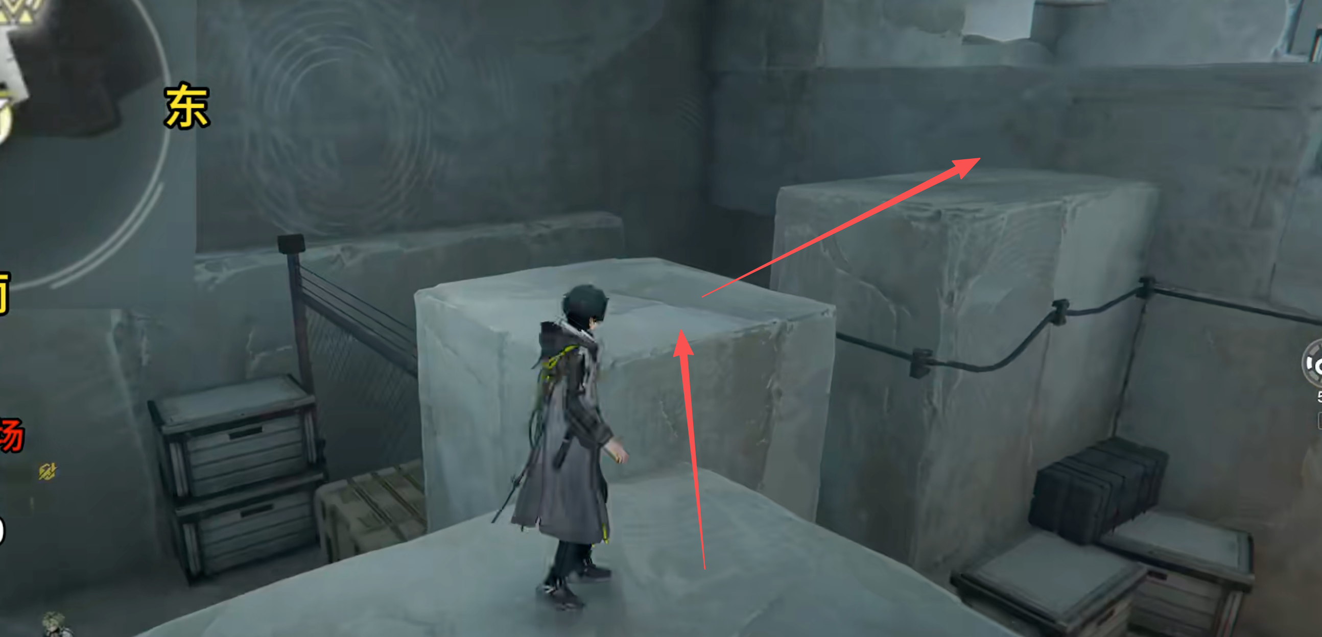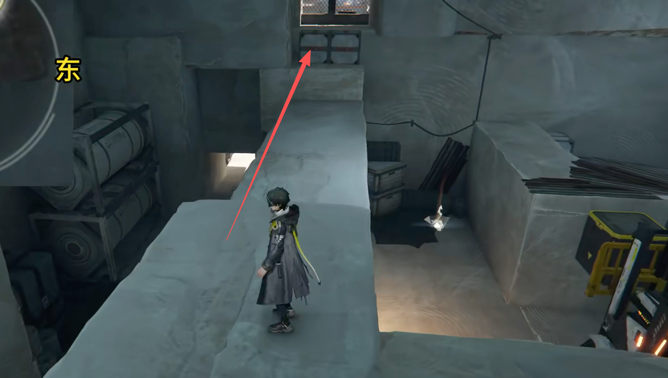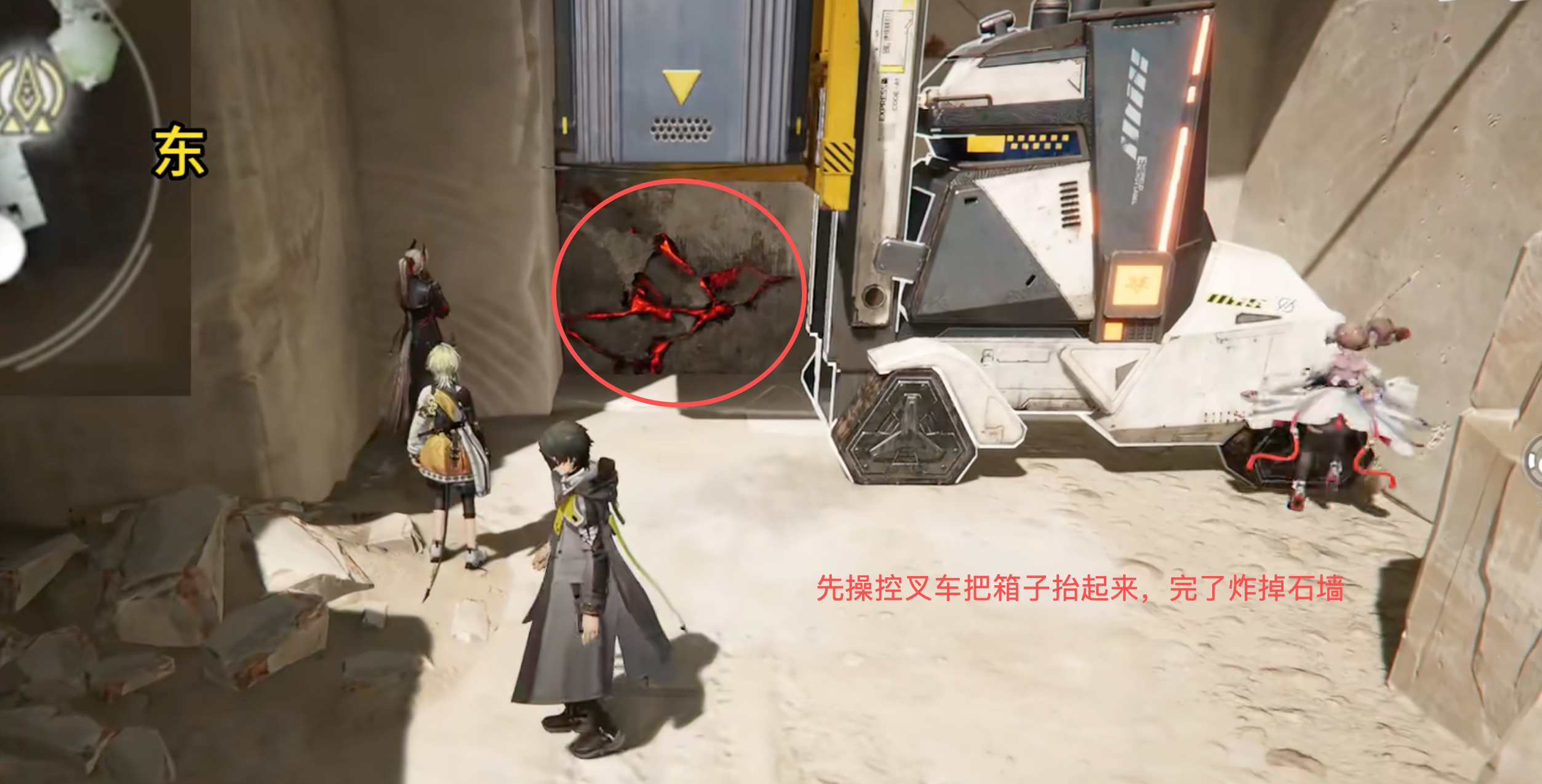 刚开始进来的时候需要先操作叉车把箱子抬起来,然后把墙炸开了再进去,一路上遇到的叉车都抬起来,然后看图示找到醚质点位