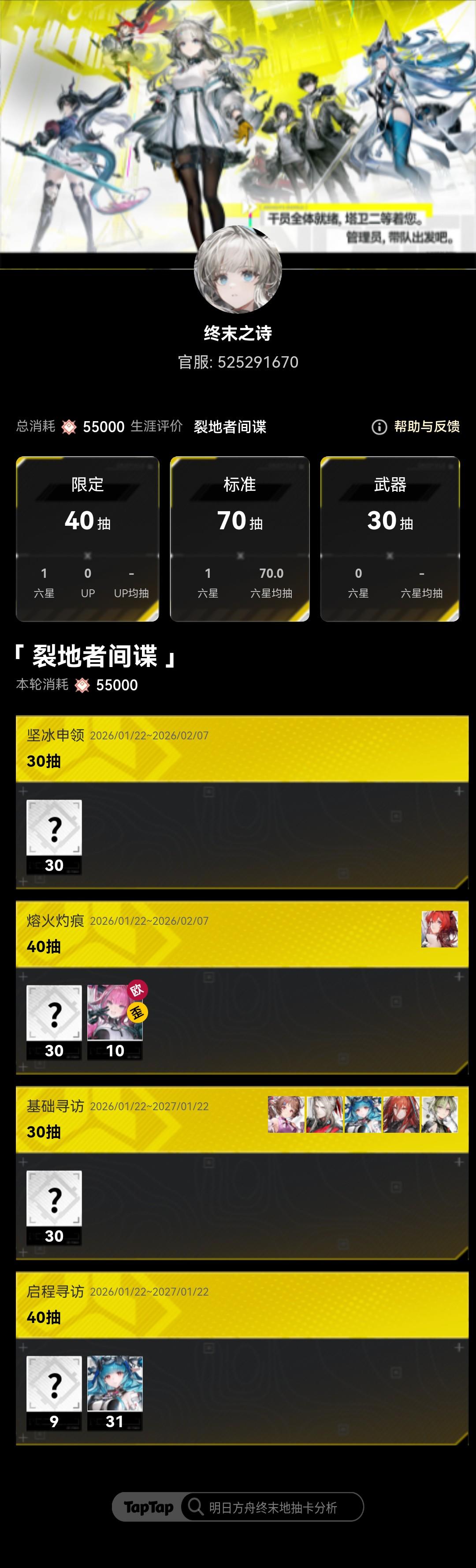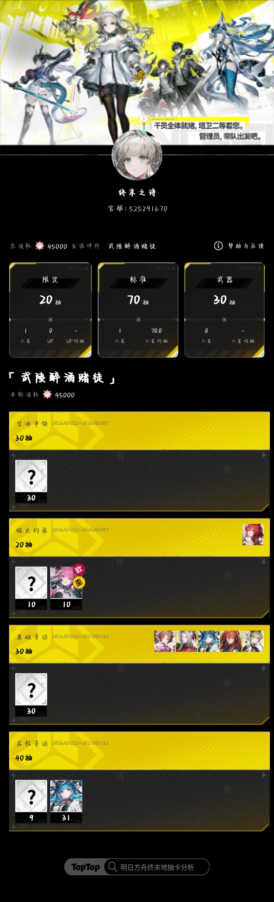 肝了几天终于凑够了抽卡资源下池子,体验太好了,资源分散得稀碎,抽卡更是爽,42只花了120抽限定就出了,小保底给的重复的小羊.武器池也是舒服尼玛的80抽出专武,除了专武其他武器一个没有。古德古德,抽完人已经力竭,早应该放弃才是对的。