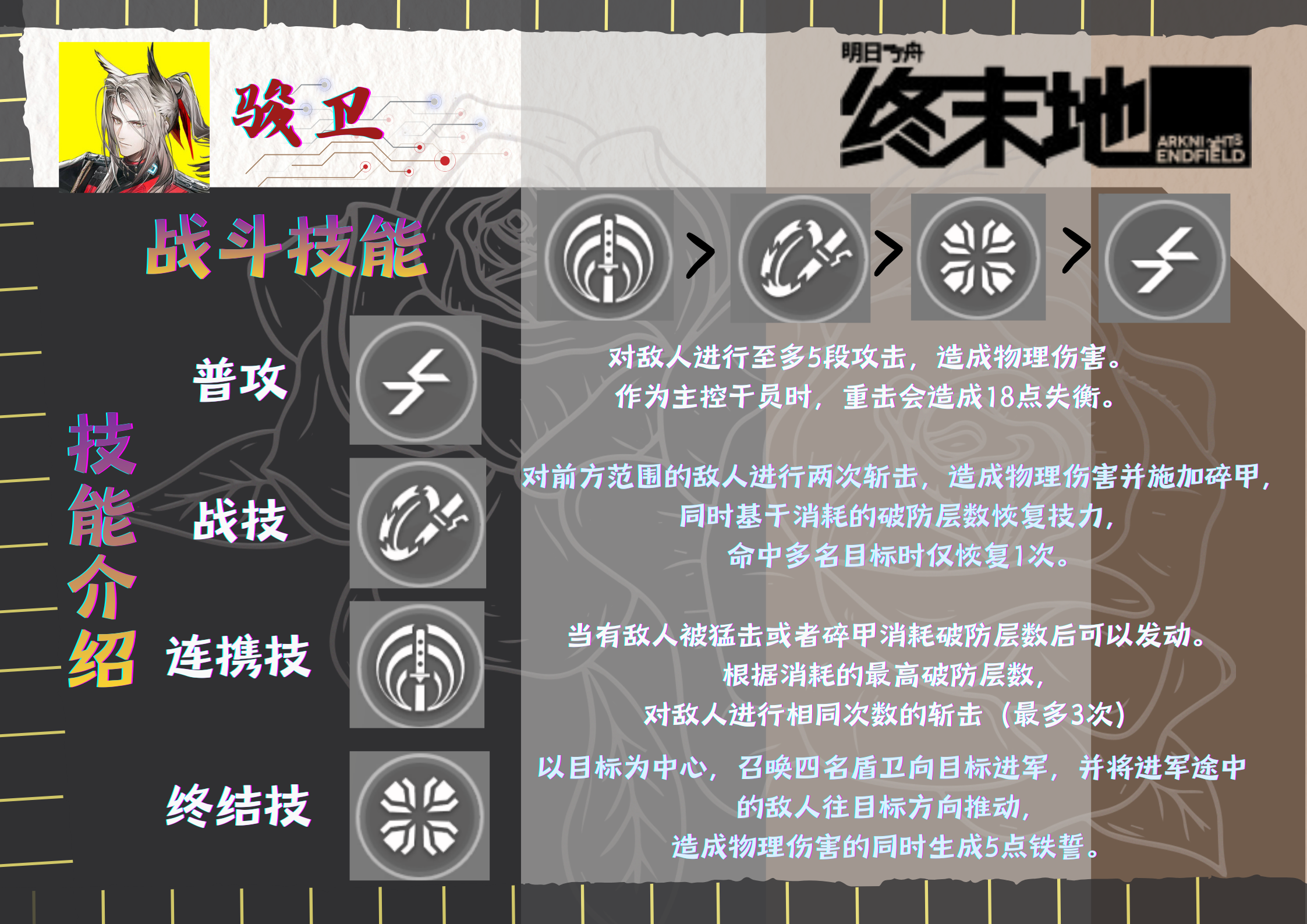 首先恭喜大家点开这份攻略!撒花🌸想到大家都已经拿到属于自己的骏卫老爷了。物理流破防队是有一定上手难度的队伍 。我们需要叠破防层数,满四层消耗破防,打出连携。,从而造成大量伤害。一旦搞明白这个流程之后,物理干员就可以随意搭配,一通百通。 ★★★★★★战斗技能方面推荐:连携技优先然后是战技,终结技,最后点普攻。输出手法说起来也很简单,叠满四层破防,直接一个消耗,打出大量伤害。在没叠满