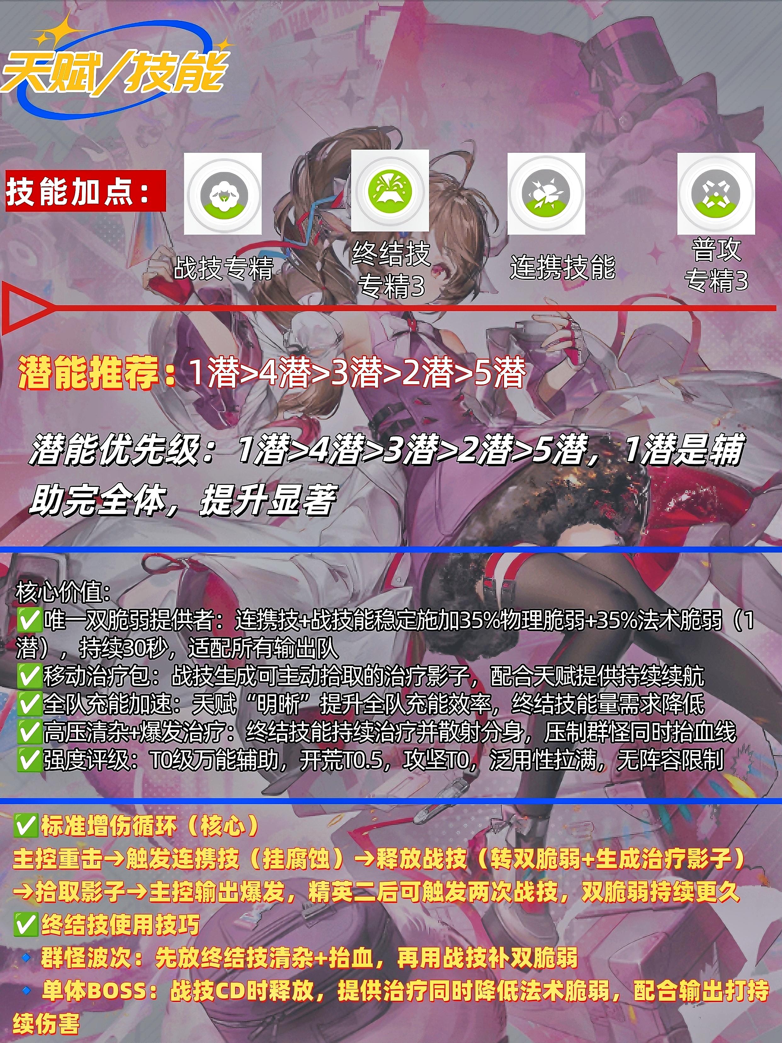 🚨免费送的T0全能辅助,练就不亏! 第三天签到领本体,第十天领专武。她是当前唯一能同时提供物法双脆弱的辅助,开荒/攻坚通吃,配谁都强! ✅️角色核心定位与强度🔹定位:6星自然系辅助,治疗+物法双脆弱减抗全能型,终末地开服泛用辅助之一✅️核心价值:🔹唯一双脆弱提供者:连携技+战技能稳定施加35%物理脆弱+35%法术脆弱(1潜),持续30秒,适配所有输出队🔹移动治疗包:战技生成可主