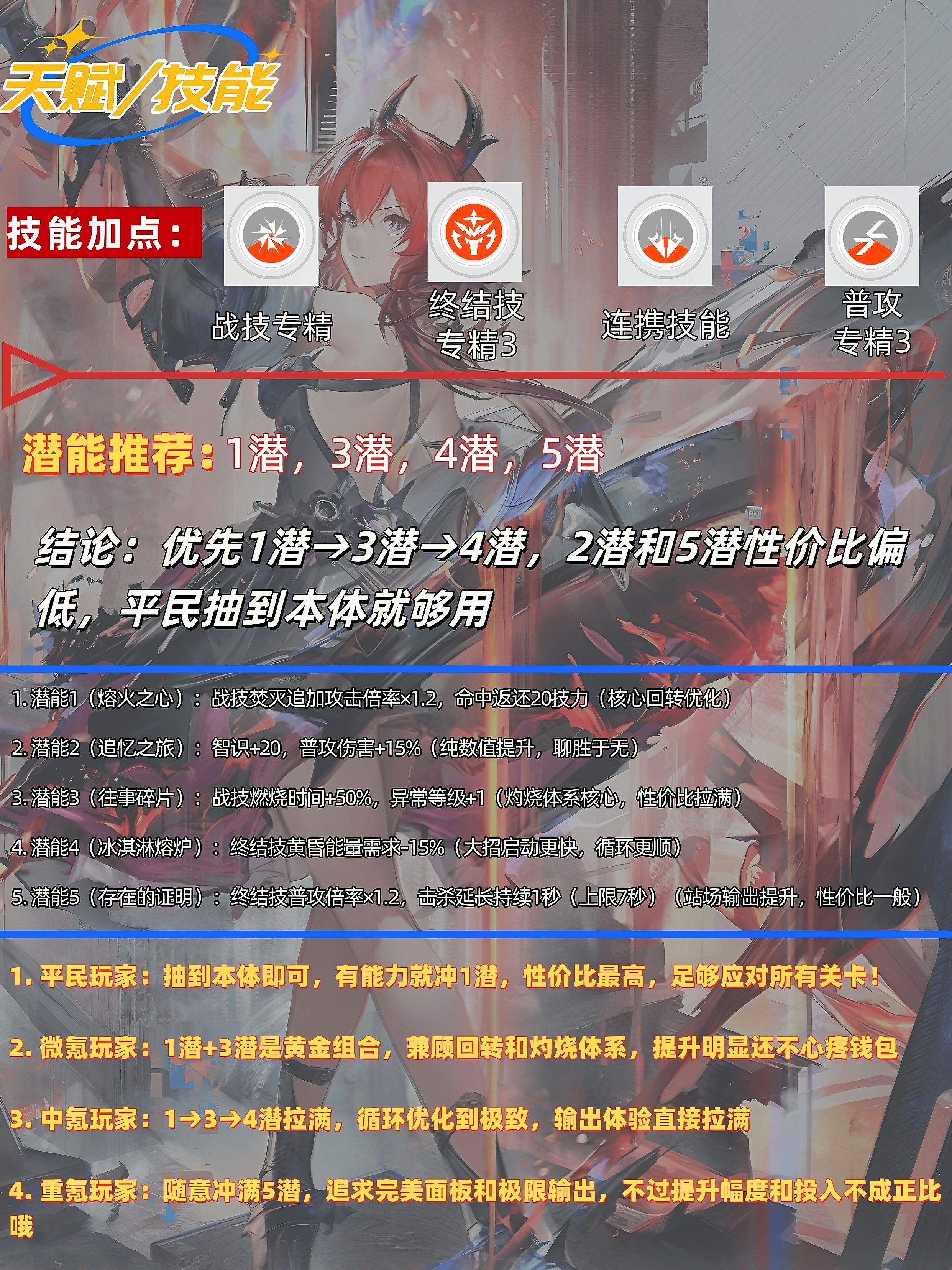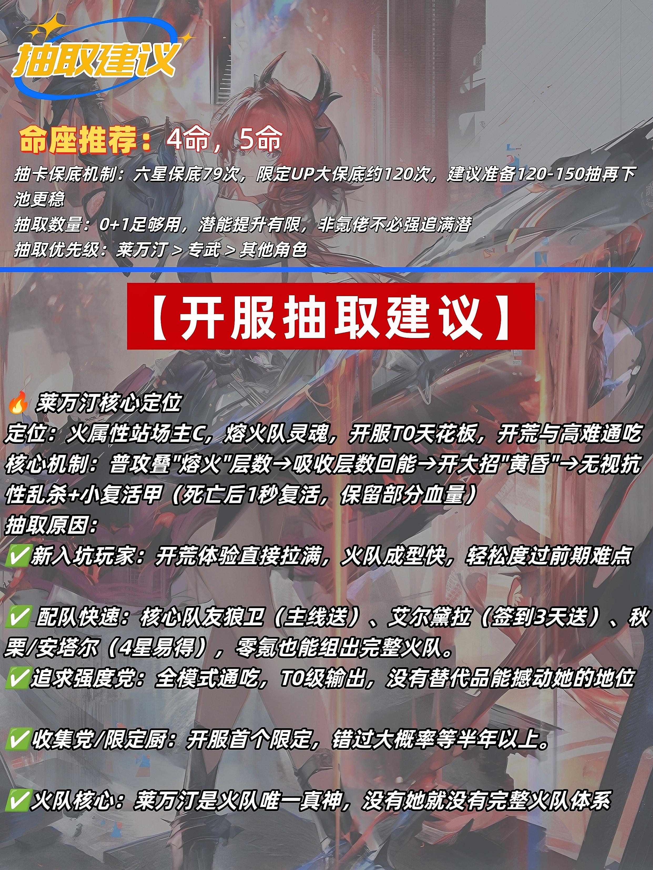 🔥 莱万汀养成:定位:火属性站场主C,熔火队灵魂,开服T0天花板,开荒与高难通吃🚨核心机制:普攻叠"熔火"层数→吸收层数回能→开大招"黄昏"→无视抗性乱杀+小复活甲(死亡后1秒复活,保留部分血量)T0优势✅️群输出高:小怪关卡一波清屏,BOSS战爆发顶尖✅️生存拉满:自带复活甲,容错率远超其他主C✅️配队0氪:核心队友狼卫(主线送)、艾尔黛拉(签到3天送)、秋栗/安塔尔(4星易